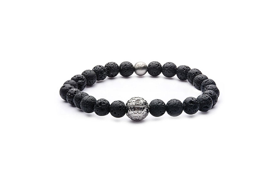 This fantastic new Death Star bead bracelet is now available at ThinkGeek. The elastic stretch bracelet features a stainless steel 3D sculpted bead of the Death Star, surrounded by black lava rock beads made from molten basalt.