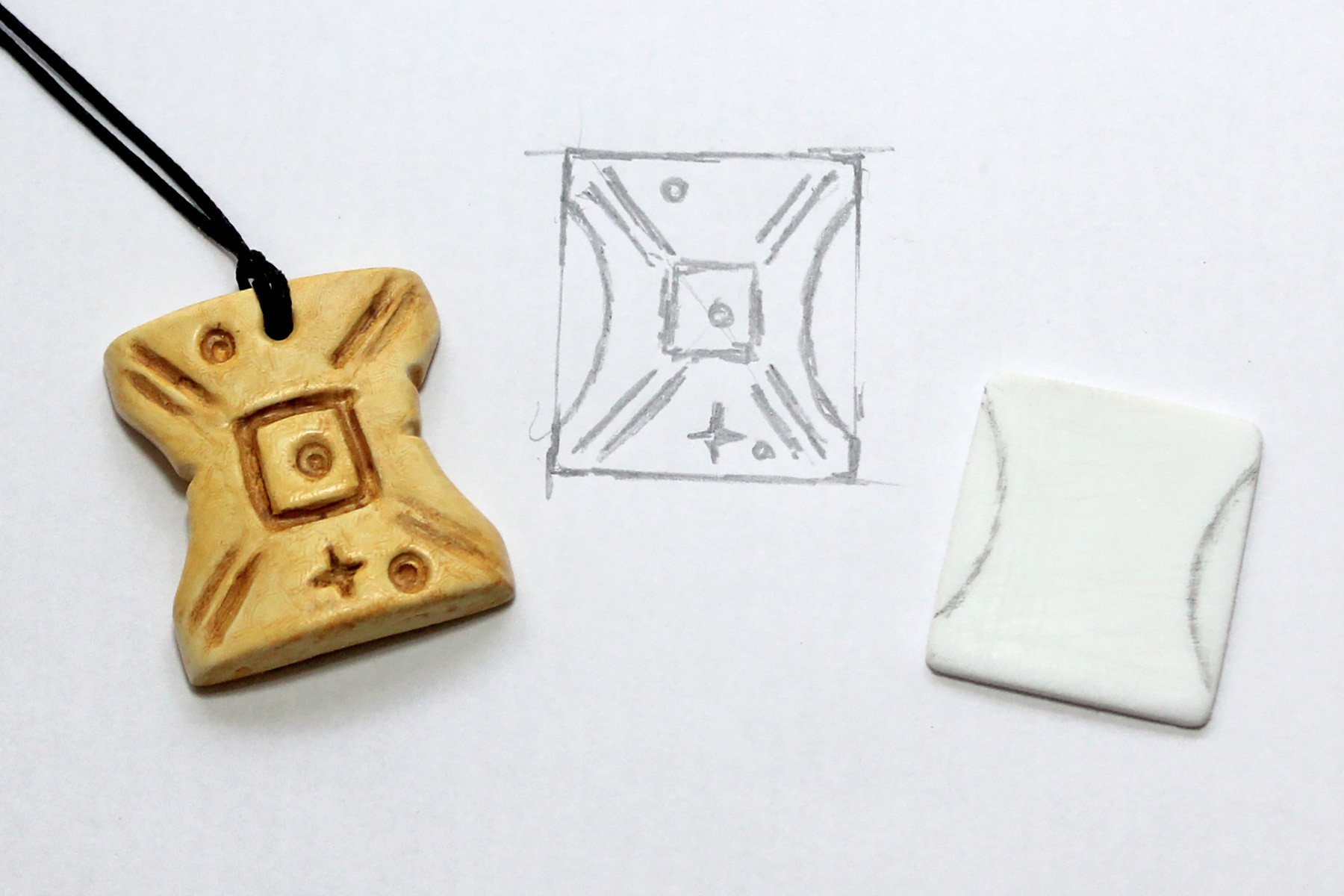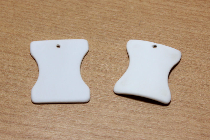 The next step is optional – on one of my pendants, I took a Dremel hot knife and very carefully engraved the design (after practising a few times on a scrap piece of plastic). This gives a closer finish to the original design, but does require additional tools. I had also tried engraving with a standard Dremel (rotary tool), but the hot knife gave a cleaner edge to the cuts. I also used the hot knife to create the small ‘knicks’ in the side of the pendant (one on the left curved edge, 2 on the right curved edge).