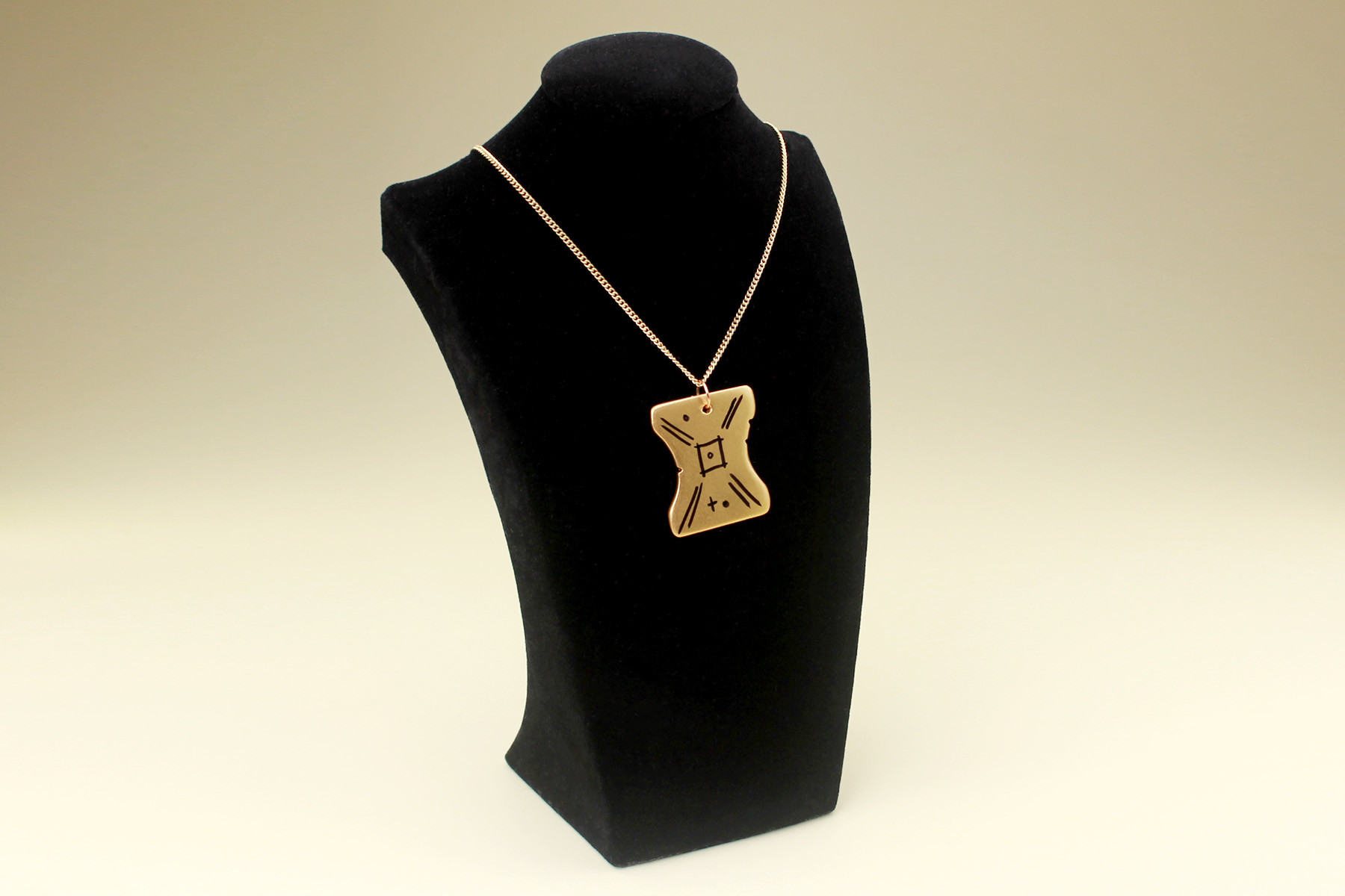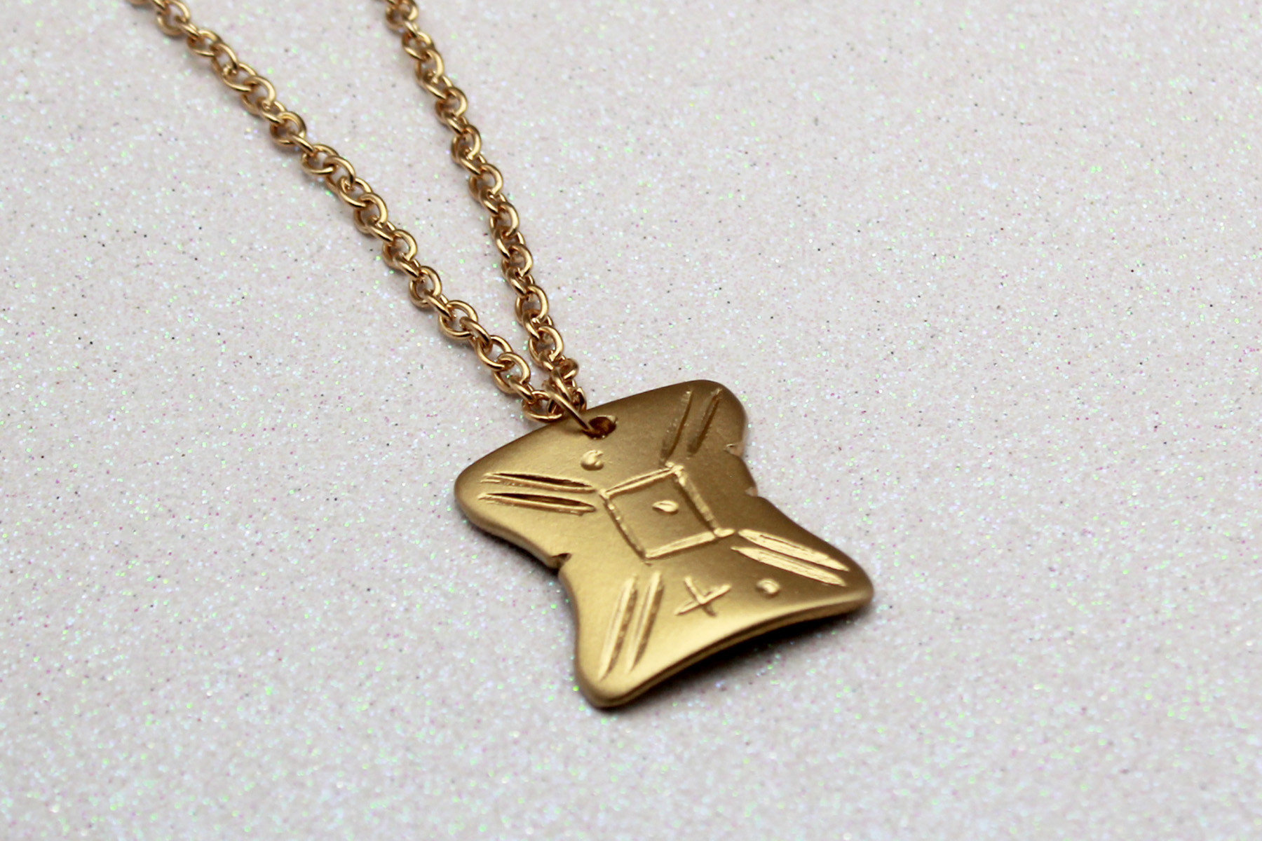 My engraved pendant was finished, so I attached a gold-tone jump ring through the top hole and strung it onto a gold-tone chain necklace. Here you can see it next to my original prop version – it still has the all the details and shape of the original, just slightly smaller and with a gold-tone finish, for a more ‘everyday wearable’ version. I absolutely love it!