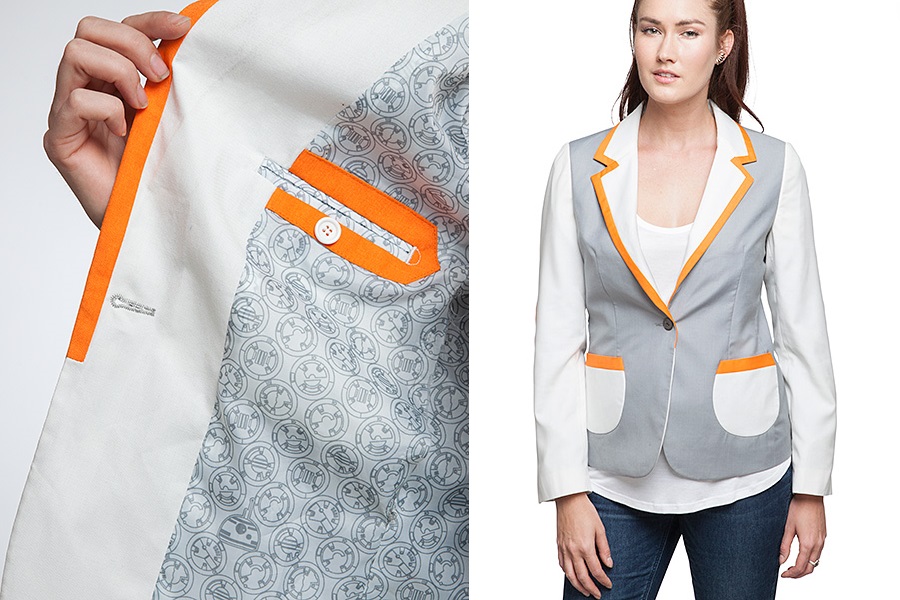 This women’s Star Wars BB-8 blazer is now available at ThinkGeek. The grey jacket features contrast white sleeves, pockets and collar, with orange accents. The exterior button features the Resistance ‘starbird’ symbol, and the printed lining fabric features a repeating design inspired by BB-8 panels.