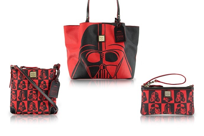The Run Disney website has revealed the Dooney & Bourke handbag designs for the upcoming Star Wars Dark Side Half Marathon event! The new collection includes 3 bags – a slim wristlet, letter carrier, and tote bag. The 2 smaller bags feature a split black and red style print of Imperial helmets including Darth Vader, Royal Guard, TIE Pilot and Stormtrooper. The large tote bag has a single large black and red Darth Vader design on the front, quite striking!