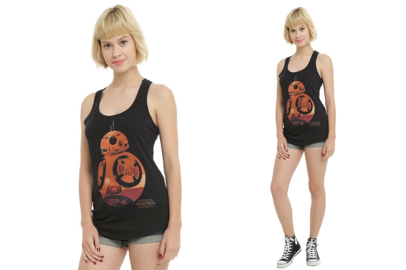 Hot Topic has a new women’s Star Wars tank top available. The women’s black racerback tank top features a front print of BB-8’s silhouette filled with an orange-tone image of Rey on her speeder on Jakku. The tank top is available in sizes XS to 3X, and is priced at US$20.50 to US$24.50 each (depending on size) – Hot Topic can ship internationally.