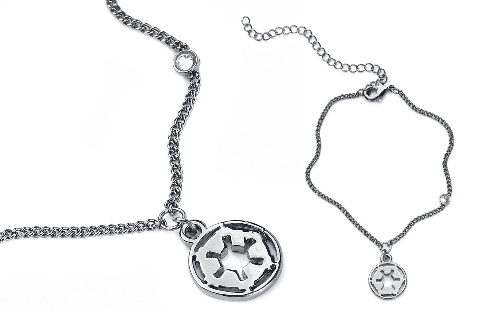 This Star Wars Galactic Empire Symbol bracelet is available at EMP Online. The dark-toned chain bracelet features a cut-out Galactic Empire ‘cog’ symbol charm, and a small clear rhinestone gem accent on the chain. The bracelet is adjustable, with a lobster claw-style clasp and length of wider adjustment chain (length approximately 15.5cm to 22cm).