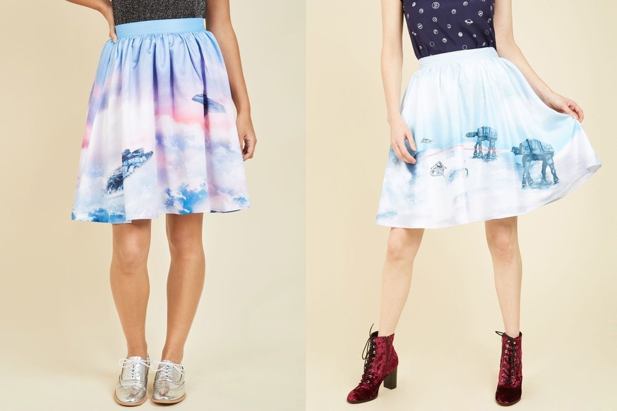 Exciting news! For fans who missed out on the gorgeous Her Universe pin-up dresses, they are now available as skirt versions from ModCloth! The skirts appear to be the same style as the Lightsaber skirt which is coming soon to ModCloth – a shorter version of the original design. These skirts feature the same amazing artwork as the original pin up dresses – the Bespin skirt features blue and pink tones, while the Hoth skirt features blue and grey tones.