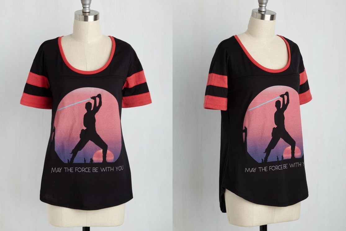 ModCloth has a new women’s Rey t-shirt available. The black t-shirt features two pinkish-red contrast stripes on each sleeve, and contrast neckline binding. The front print is a silhouette of Rey with a lightsaber against a Jakku sunset, with the text ‘May The Force Be With You’ underneath. Priced at US$34.99 each, the t-shirt is available in sizes S to XXL – ModCloth can ship internationally.