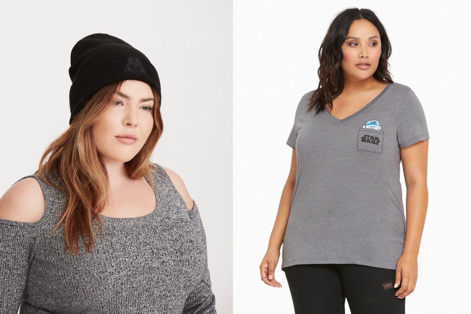 New arrivals at Torrid include 2 women’s Star Wars items. The first is a grey v-neck t-shirt, which features a printed pocket on the upper left chest, with R2-D2 poking out. The second new item is a black knitted beanie with an embroidered Darth Vader mask on the front cuff.