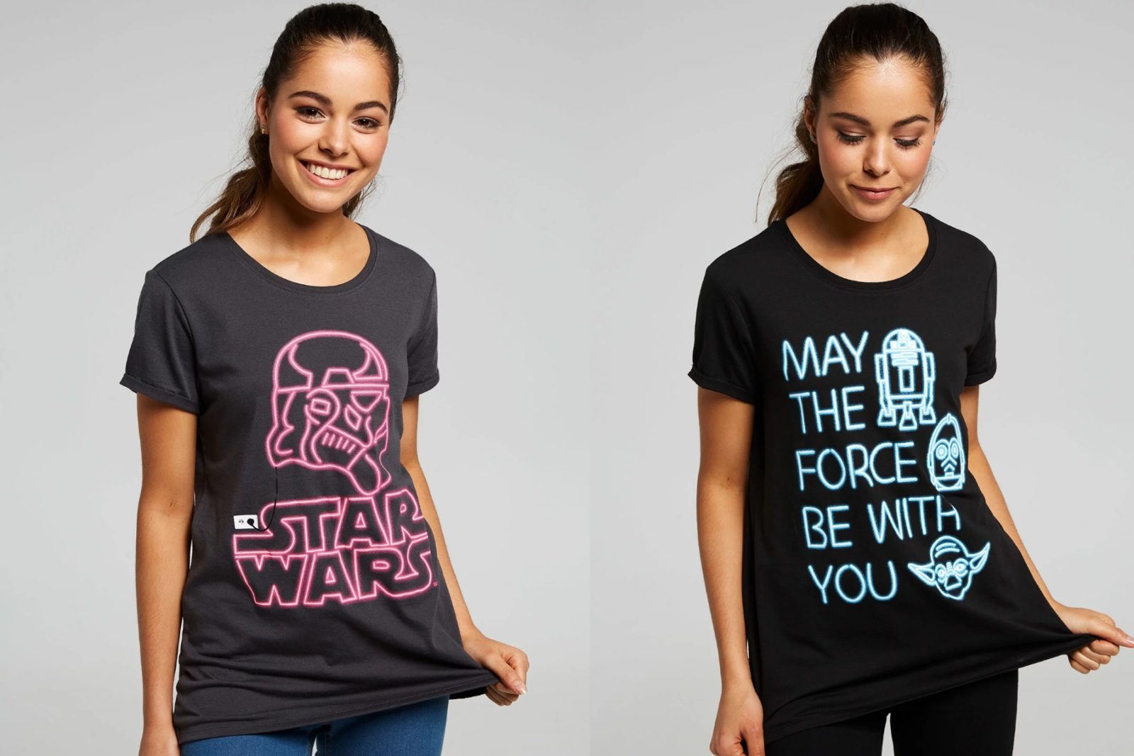 Australia/New Zealand based store Jay Jays has 2 new women’s Star Wars t-shirts available. The first is a charcoal grey t-shirt with a pink neon print of a Stormtrooper helmet with the Star Wars logo, while the second is a black t-shirt with a blue neon print of the classic Star Wars quote ‘May The Force Be With You’, alongside little images of R2-D2, C-3PO, and Yoda. Both shirts are made from 100% cotton.