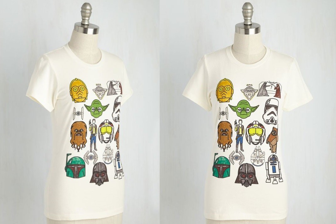 ModCloth has a new women’s Star Wars t-shirt available. The women’s ivory colour t-shirt is made from 100% cotton, and features a front print of Star Wars characters and vehicles in a style reminiscent of a colouring book. The front design includes C-3PO, Imperial Star Destroyer, Darth Vader vs. Obi-Wan, TIE Fighter, Yoda, Stormtrooper, Chewbacca, Han Solo, X-Wing pilot helmet, Wicket, Boba Fett, TIE Advanced, Darth Vader, Millennium Falcon, and R2-D2. Priced at US$29.99 each, the t-shirt is available in sizes S to XXL – ModCloth can ship internationally.