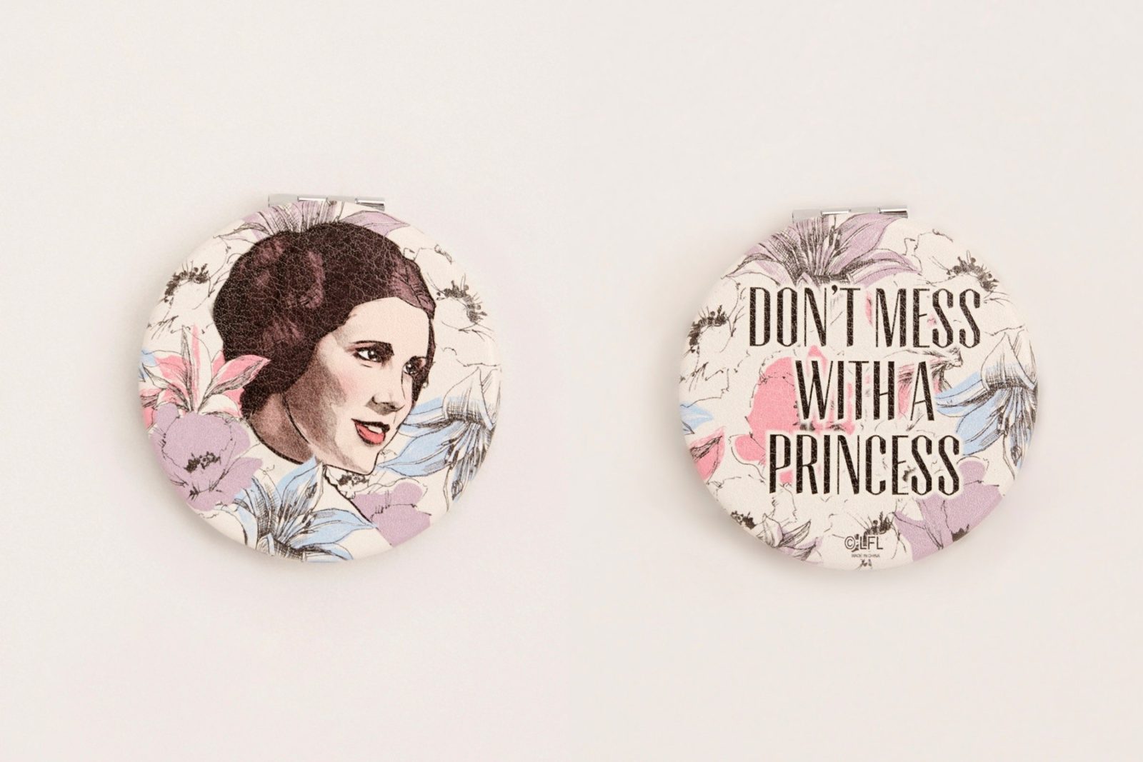 The back of this super sweet floral print compact mirror sends a clear message to any half-witted, scruffy-looking Nerf herder: “don’t mess with a princess.” A Princess Leia graphic gives some extra sass.
