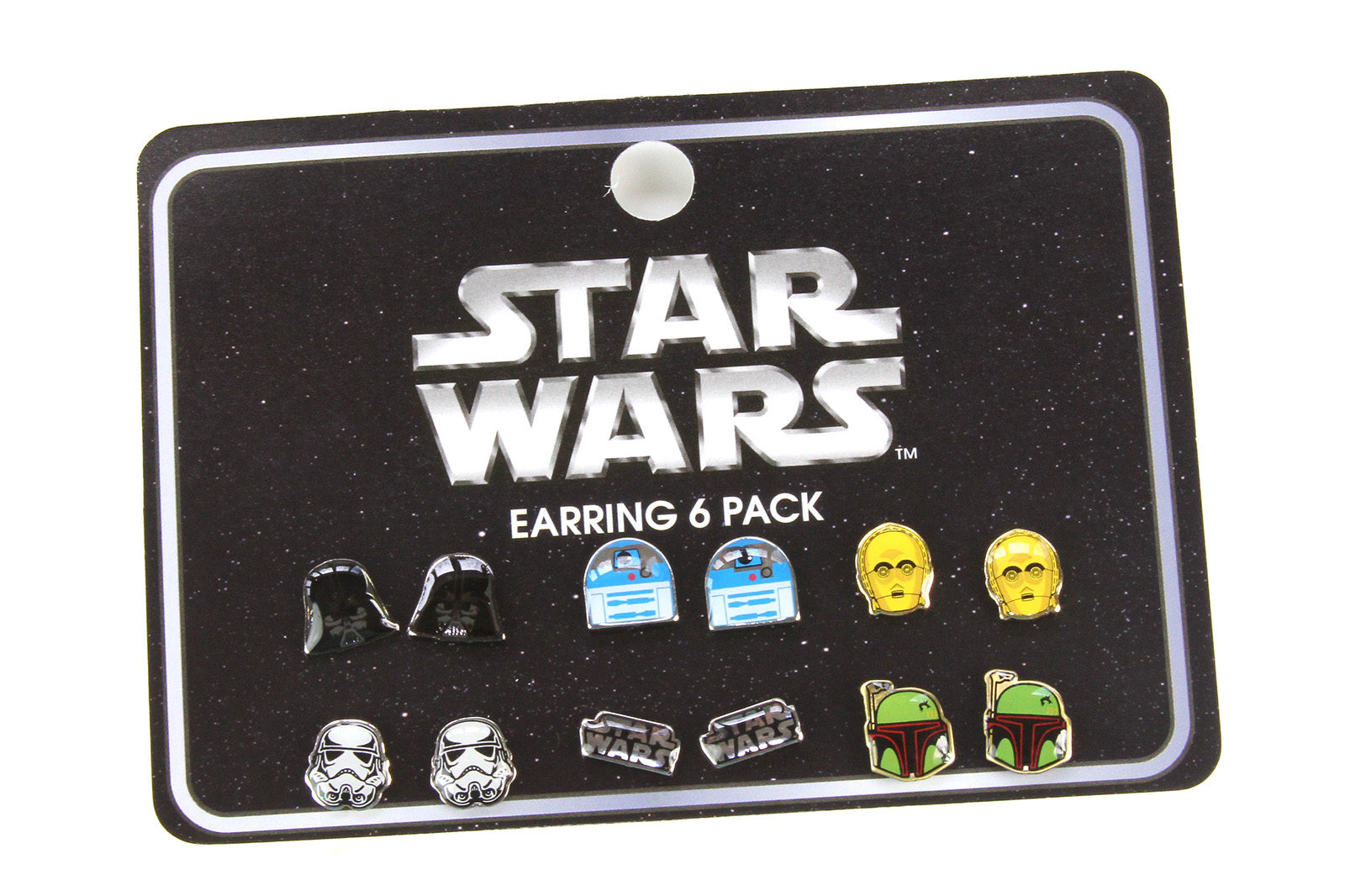 The six pairs include Darth Vader, C-3PO, R2-D2, stormtrooper, Boba Fett and the Star Wars logo. They are a good size, each approximately 1cm across the widest part (smaller than the Bioworld stormtrooper stud earrings). The plastic coating makes them shiny, the details are nice and clear. I paid US$10.95, very reasonable for 6 sets of earrings.