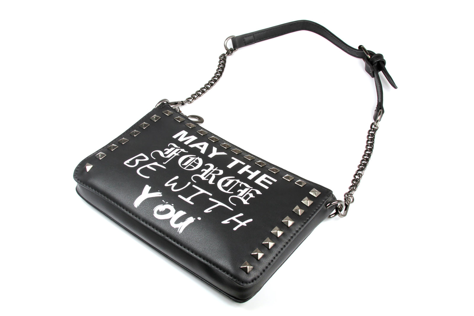 The ‘May The Force Be With You’ purse is made from black faux leather, and features the classic Star Wars quote ‘May The Force Be With You’ printed in different font styles on the front. The front panel is also decorated with dark gunmetal coloured studs around the border. The removable shoulder strap is made from dark gunmetal coloured chain with center piece of faux black leather strap with a buckle.