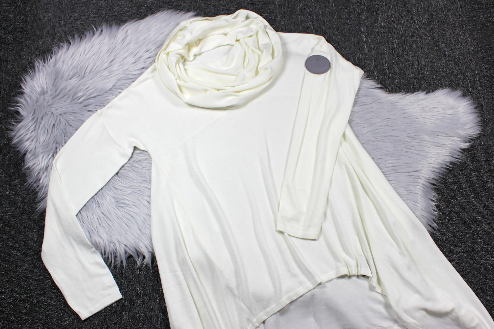 The fabric of this sweater is so lovely and soft – I just keep thinking to myself ‘buttery soft’ when holding it. It is not a true stark white, it has a cream tone to it, which is a softer colour, and perhaps a little more flattering for a large draped sweater.