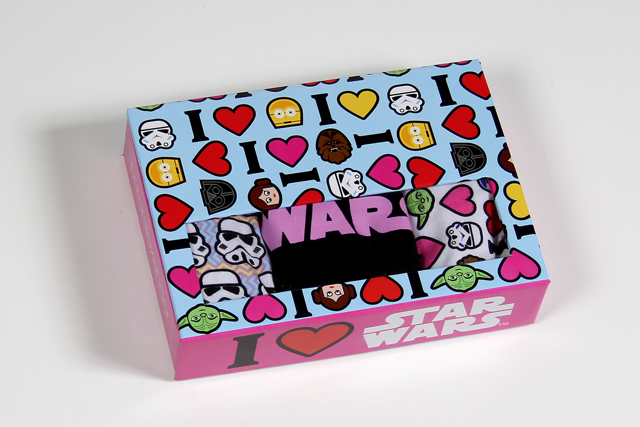 I first heard about the Peter Alexander Star Wars sleepwear collection from a fellow Star Wars collector – and of course rushed out to my local store to check it out for myself. Not being a big pajama wearer myself (shhh…), and having spent a bit in recent on-line shopping, I left the store empty handed. A little while later, I was at the same mall and noticed a sale sign in their window, so peeked in to see if they still had some of the Star Wars collection. A smaller selection was still there, and on sale! After a while trying to decide, I chose to buy the boxed 3-pack set of Star Wars women’s underwear. The original price was NZ$59.99, but the 20% off sale brought it down to NZ$47.99 (working out at approx NZ$16 each, not bad for licensed designer underwear).