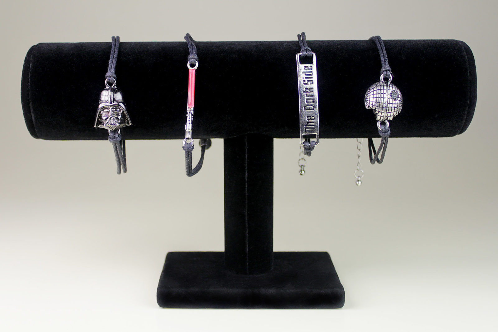 Come to the Dark Side. We have a cord bracelet set from Star Wars with Death Star, Darth Vader, lightsaber and “The Dark Side” pendants.