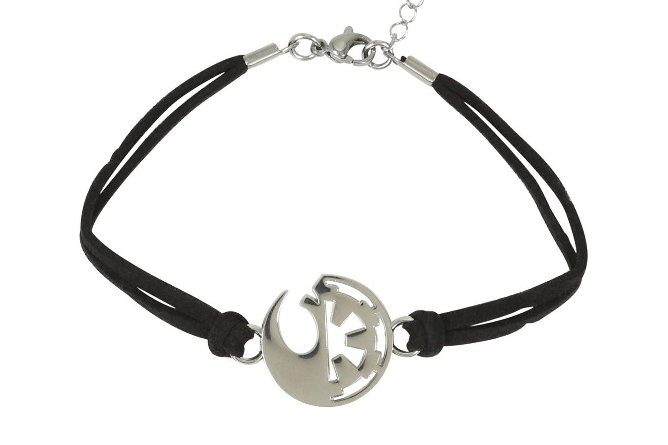 Celebrate the newest Star Wars story with this bracelet from Star Wars Rogue One. The black cord bracelet has a silver tone half Empire symbol, half Rebellion symbol charm.