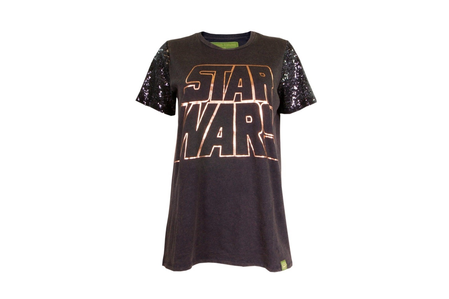 We Love Fine has a new women’s Star Wars tee available. The black tee features a metallic foil print of the classic Star Wars logo on the front, while the short sleeves feature black sequins. This is the same tee as the one also available at ThinkGeek (who can ship internationally), in sizes S to XL.