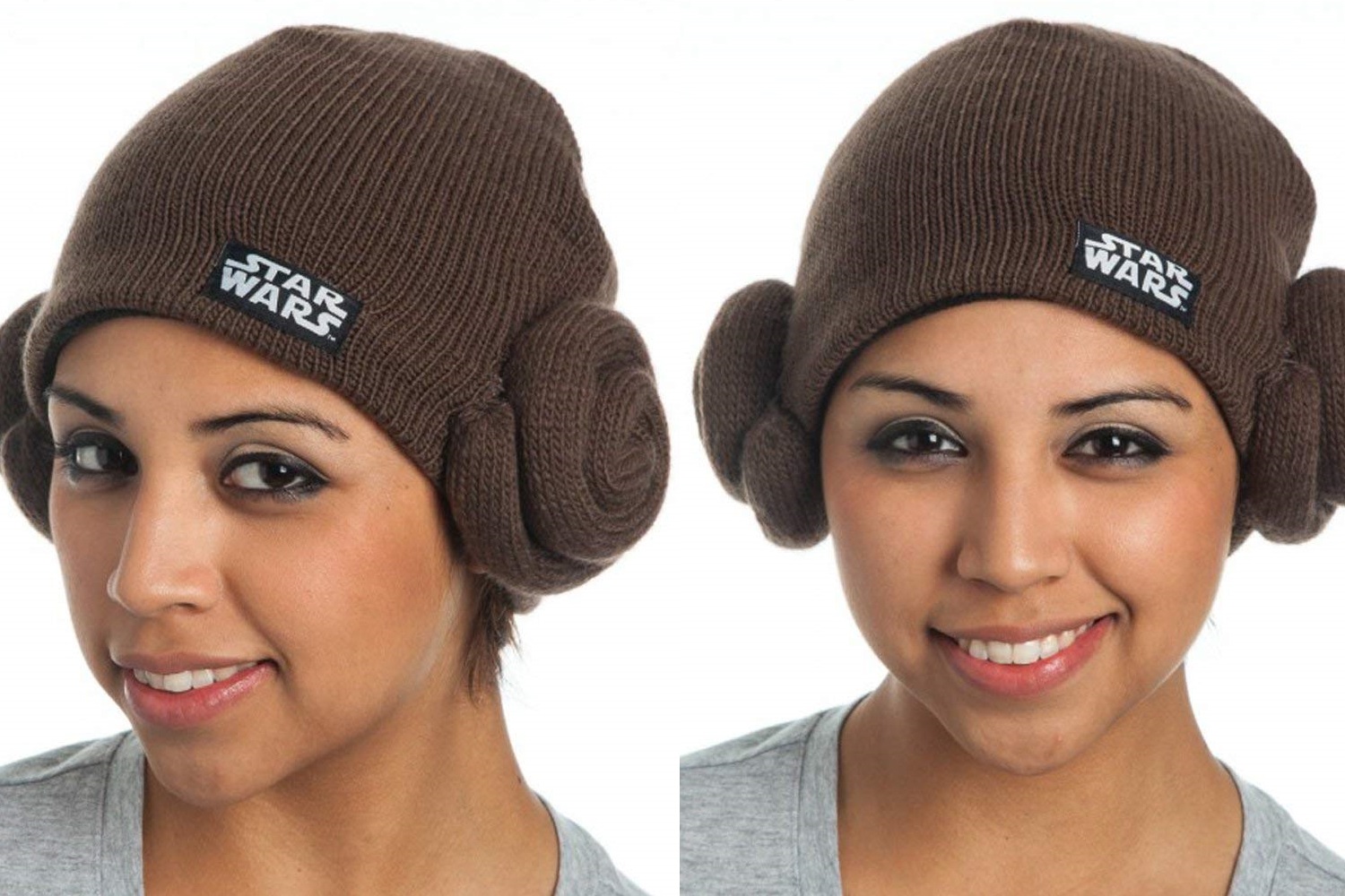 This women’s Star Wars Princess Leia knit beanie is available on Amazon. The brown knit beanie replicates Princess Leia’s classic bun hairstyle, with a spiral-shape ‘hair bun’ sewn onto each side. The front also features a fabric Star Wars logo patch. A fun hat for colder weather, and perfect for a fun Princess Leia ‘everyday cosplay’ style outfit.