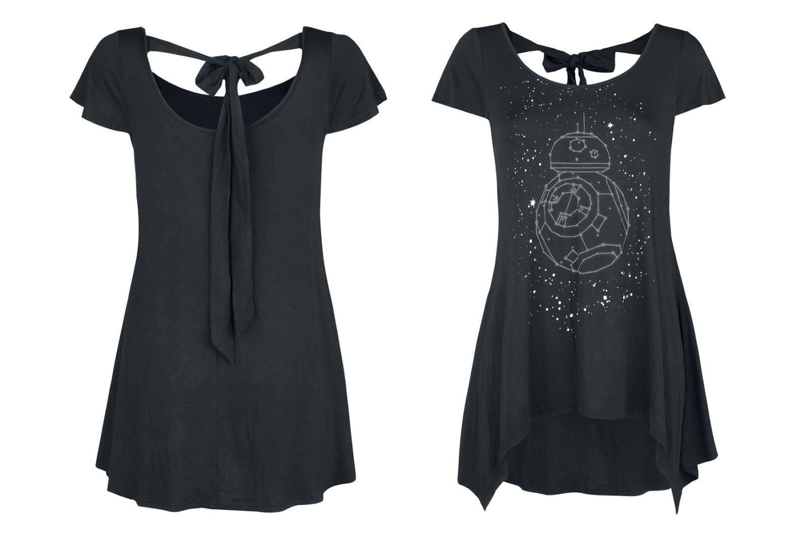 This women’s Star Wars BB-8 Galaxy top is available at EMP Online. Made from 95% viscose, 5% elastane, the black top features a front print of BB-8 in constellation-style artwork against a starry sky. The draped top features a ‘shark bite’ style front hem, and a cut-out at the back neckline accented with a long bow.