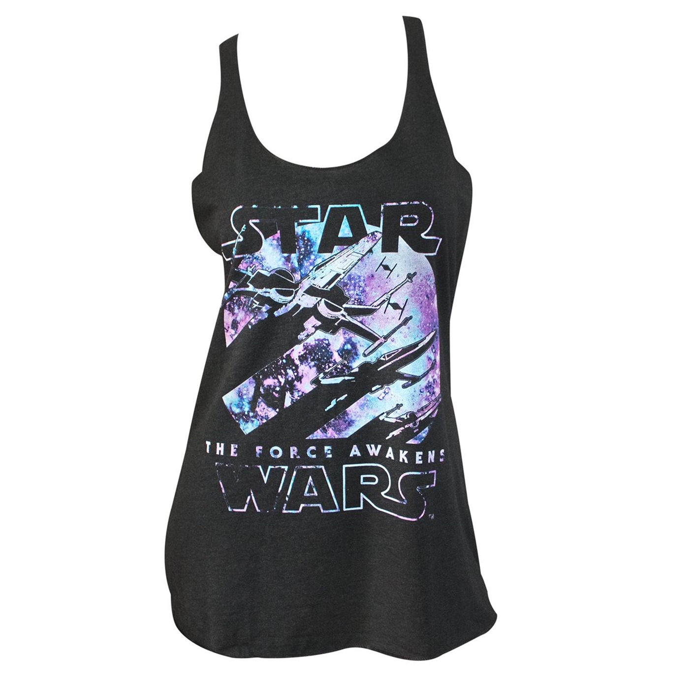 This women’s Star Wars X-Wing tank top is available at SuperHeroStuff. The black racerback-style tank top features a squadron of X-Wing fighters from The Force Awakens, with First Order TIE Fighters in the background. The artwork also features the classic Star Wars logo at the top, and The Force Awakens logo at the bottom.
