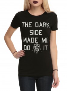- Black t-shirt featuring the text ‘ The Dark Side Made Me Do It’ – available in sizes S to 3X, priced at US$24.50 each