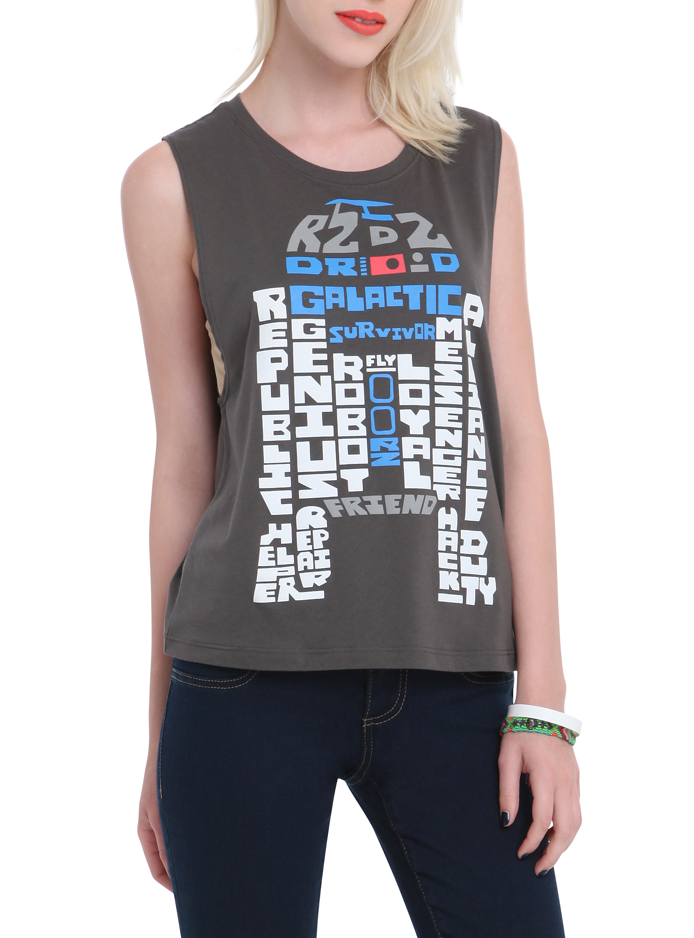 - Gray tank top featuring R2-D2 text art – available in sizes XS to 3X, priced at US$24.50 each