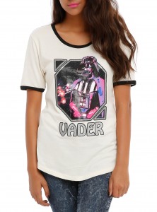 - White ringer t-shirt featuring Darth Vader glitter print – available in sizes S to 3X, priced at US$22.50 each