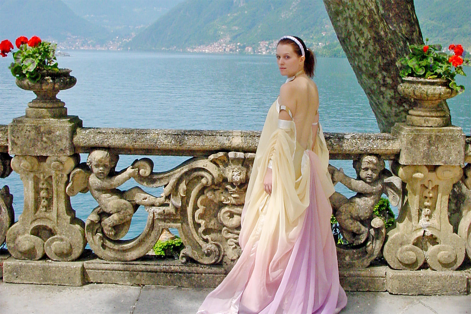 I met my husband through our shared Star Wars passion – we bought collectibles from each other online, I helped write a few articles for his Star Wars New Zealand (SWNZ) website and he helped me build a jedi comlink prop for my costume. Now my husband and I run the SWNZ website together! Our first Valentines Day together, he gave me a japor snippet he hand carved from wood – I wore it inside my wedding dress two years later. My husband proposed to me at Villa Balbianello in Italy – the filming location for Padme’ and Anakin’s first kiss and wedding scenes from Episode 2. I had recreated Padme’s lake retreat gown for the trip, but the proposal was a complete surprise, and wonderfully romantic (our story was included in this StarWars.com article).