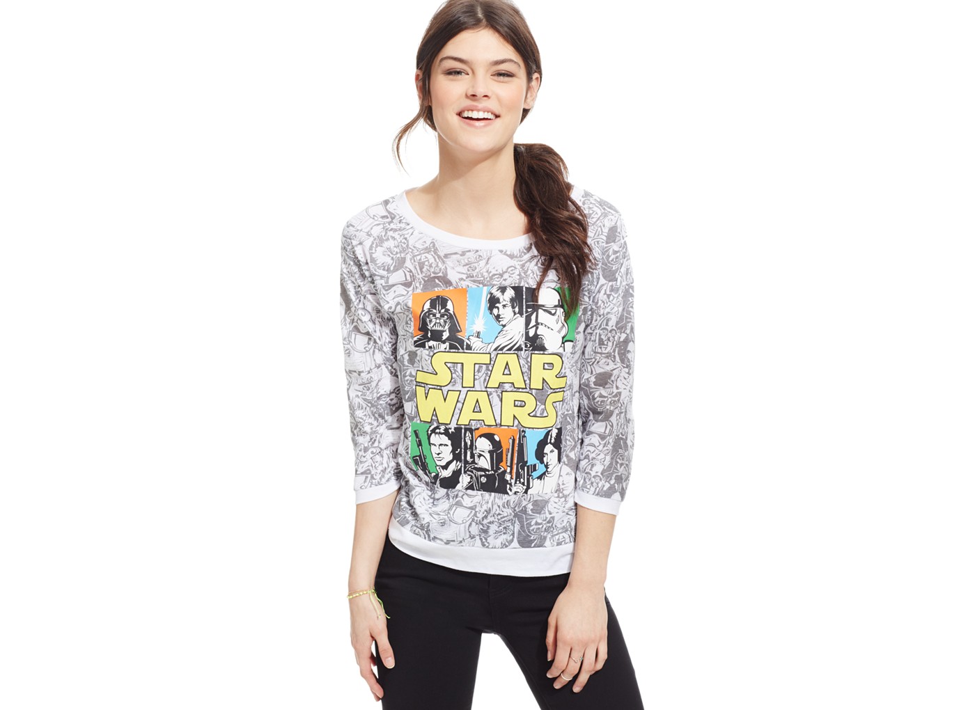 Macy’s has a new women’s Star Wars all-over print top. Made by Freeze 24-7, the pullover shirt has 3/4 raglan  style sleeves, scoop neckline with an all-over grey and white character print. The front colour graphic features Darth Vader, Luke, stormtrooper, Han Solo, Boba Fett and Leia, together with the Star Wars logo. The top is available in sizes XS to XL – originally priced at US$24.00, it is currently on sale for US$14.99 (until 31st August) – get a further 20% off with the code ‘FAVES’ (code valid until 30th August). Macy’s can ship items internationally (though they will only ship on-line orders to the billing address).