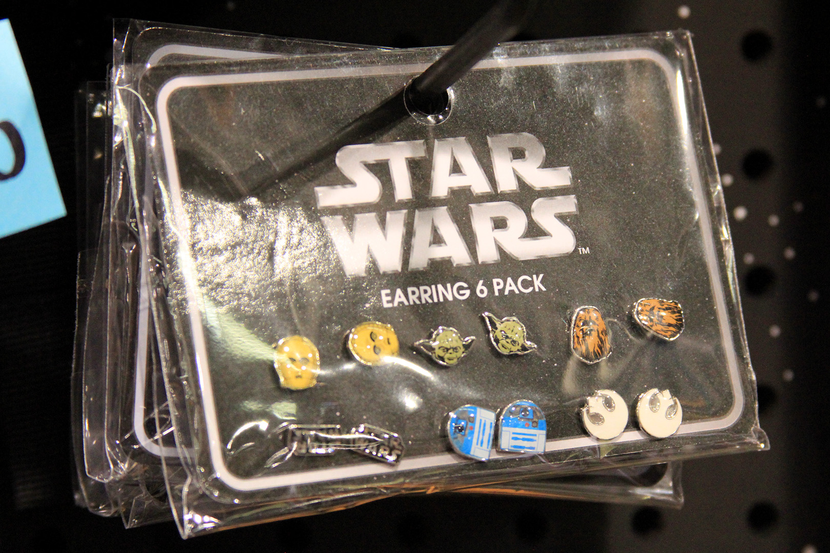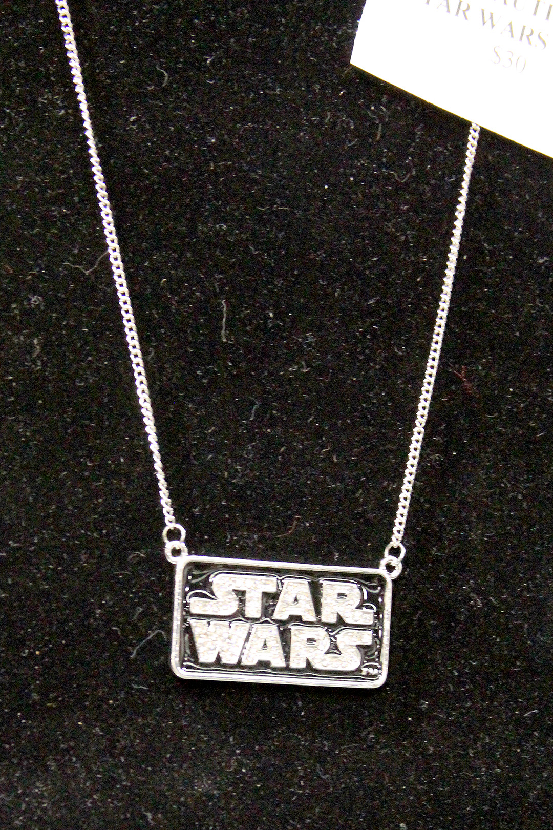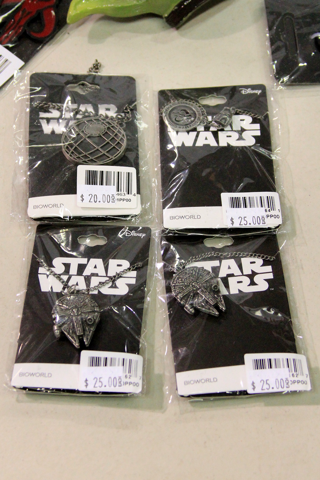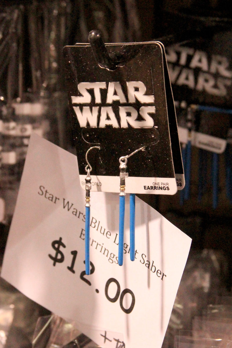 The blue lightsaber earrings are made by Bioworld – I love my pair. The four necklaces are also made by Bioworld (the Millennium Falcon necklace was available from Hot Topic recently). The carded stormtrooper necklace is a vintage piece made by Weingeroff Ent – I don’t own a carded version (bought mine loose to wear) so it was nice to see one in person. I’m not familiar with the black and silver Star Wars logo pendant, it was very pretty!