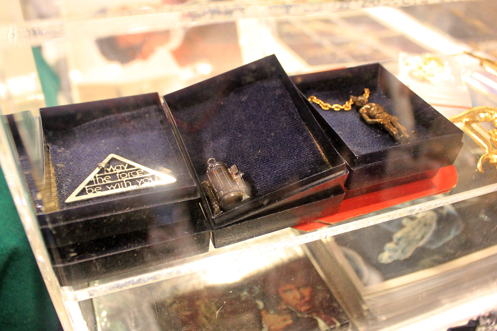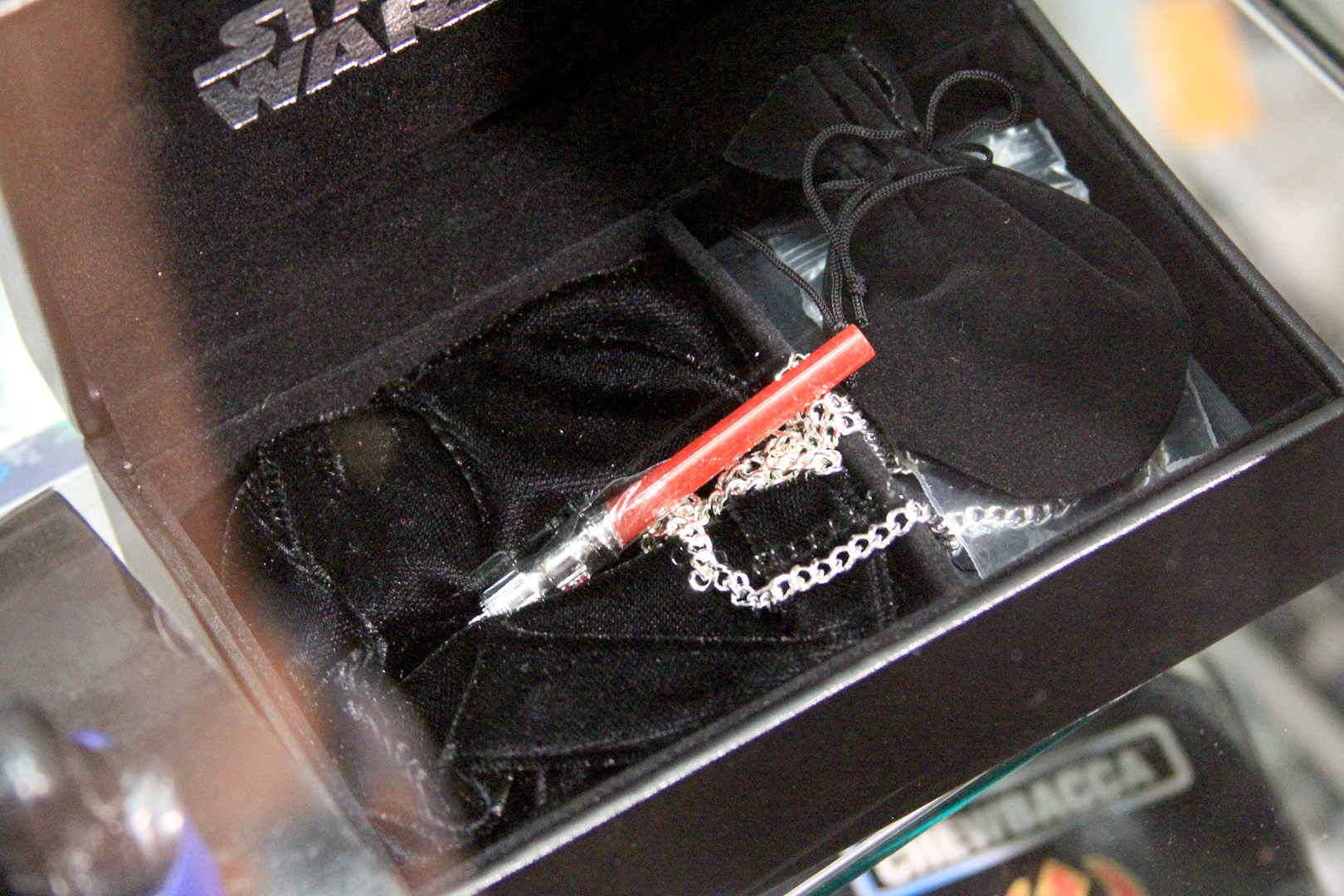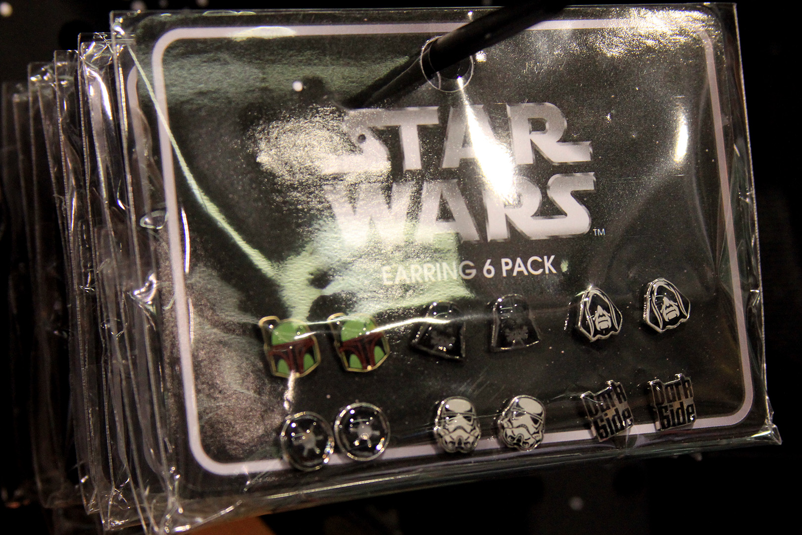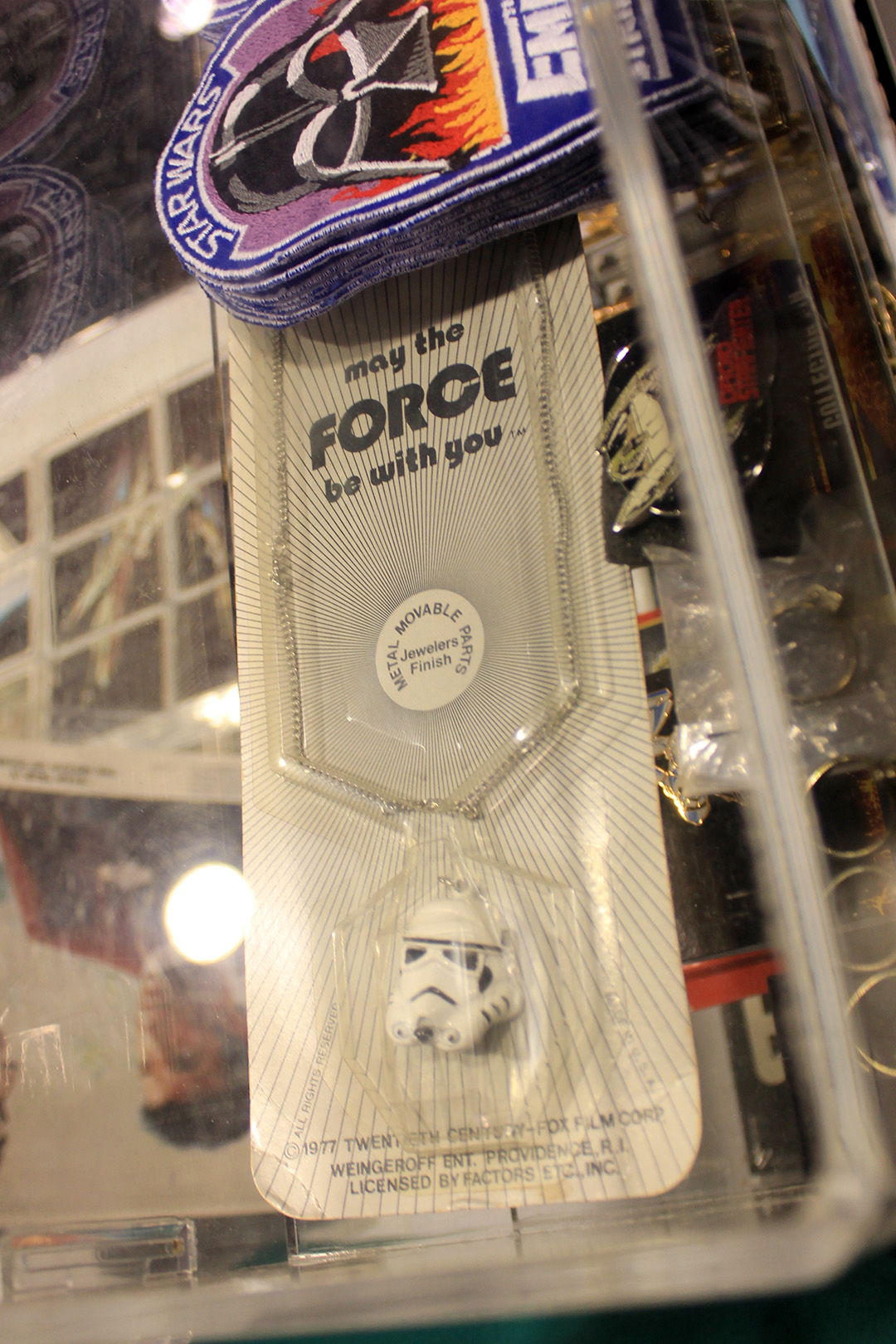 The blue lightsaber earrings are made by Bioworld – I love my pair. The four necklaces are also made by Bioworld (the Millennium Falcon necklace was available from Hot Topic recently). The carded stormtrooper necklace is a vintage piece made by Weingeroff Ent – I don’t own a carded version (bought mine loose to wear) so it was nice to see one in person. I’m not familiar with the black and silver Star Wars logo pendant, it was very pretty!