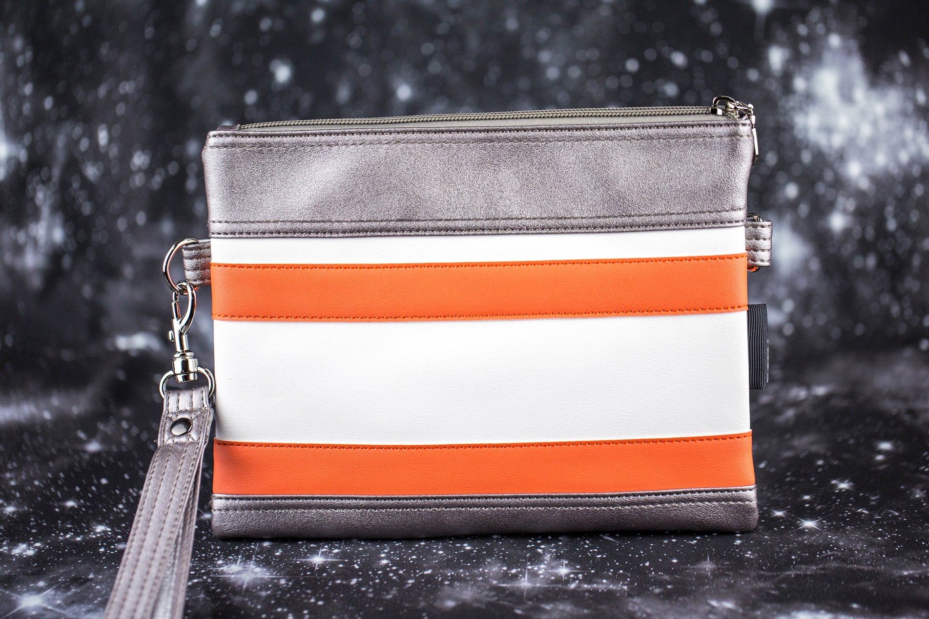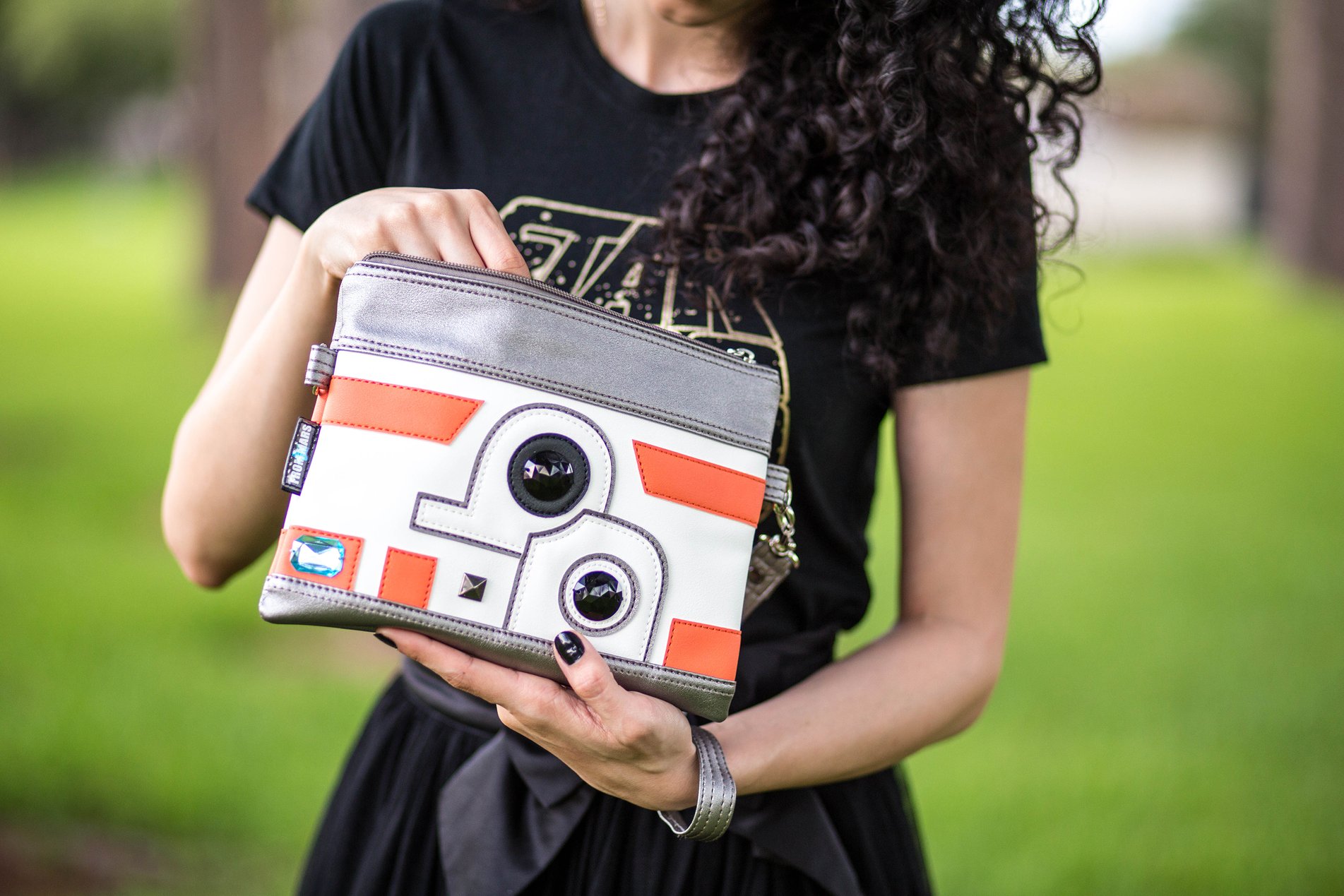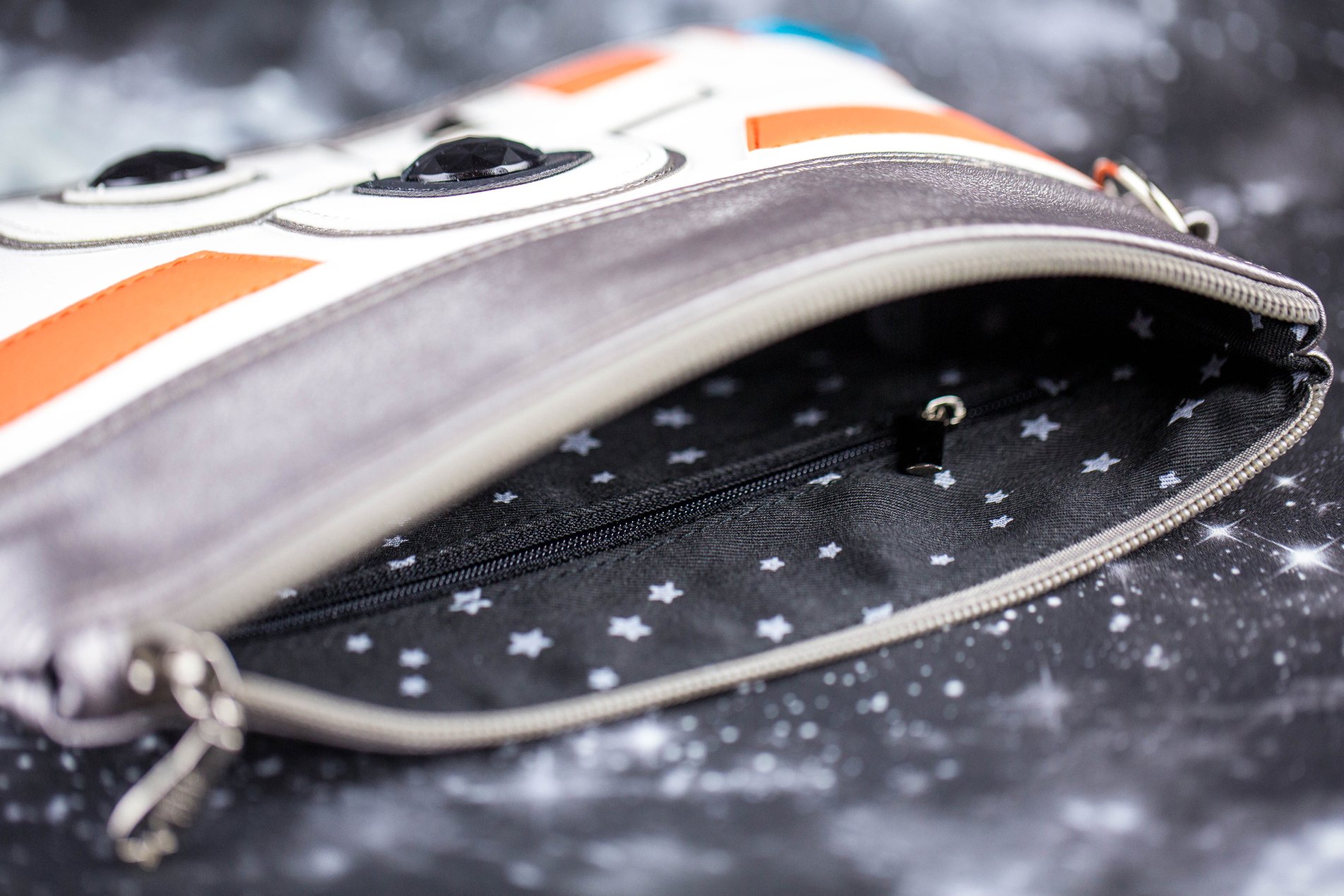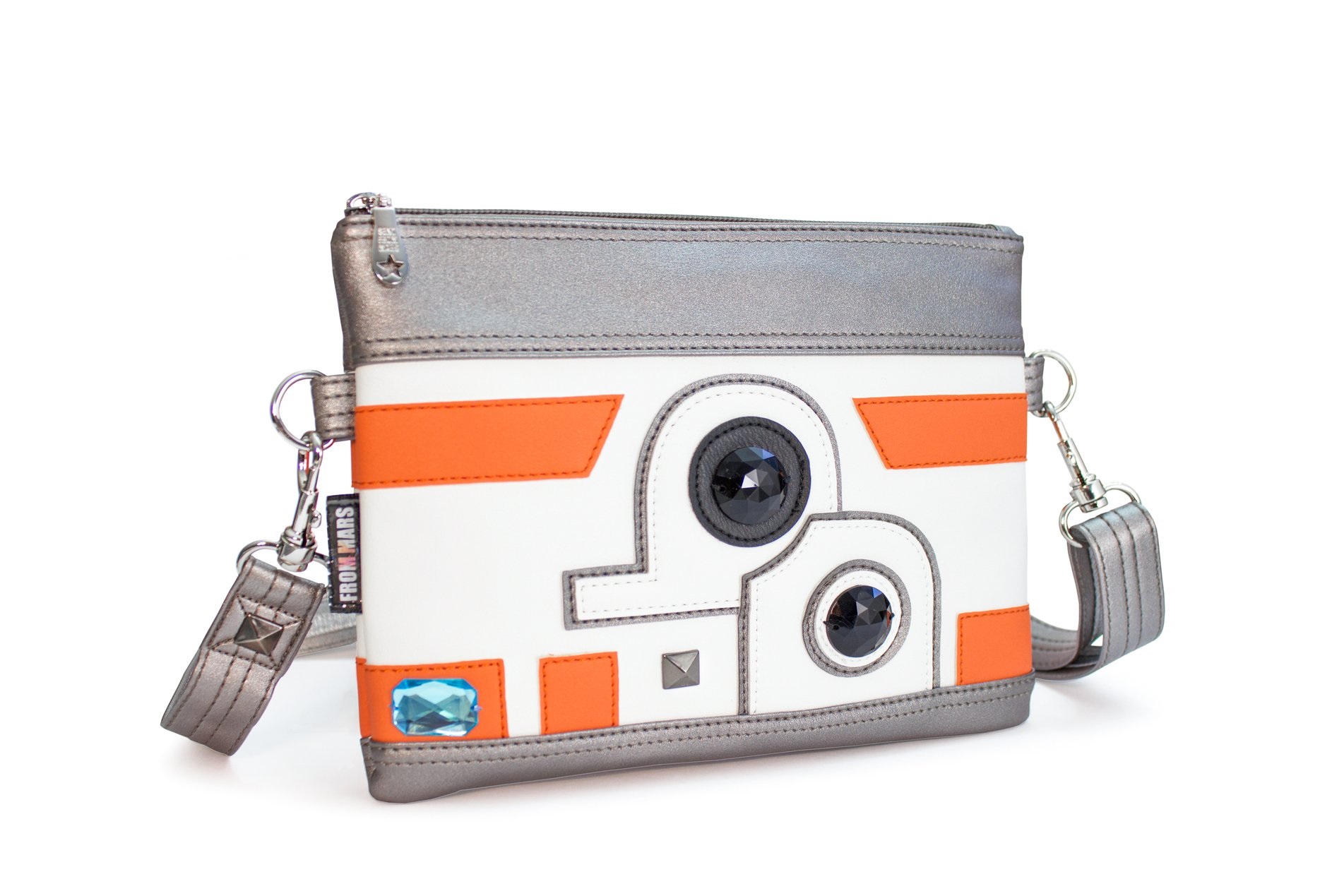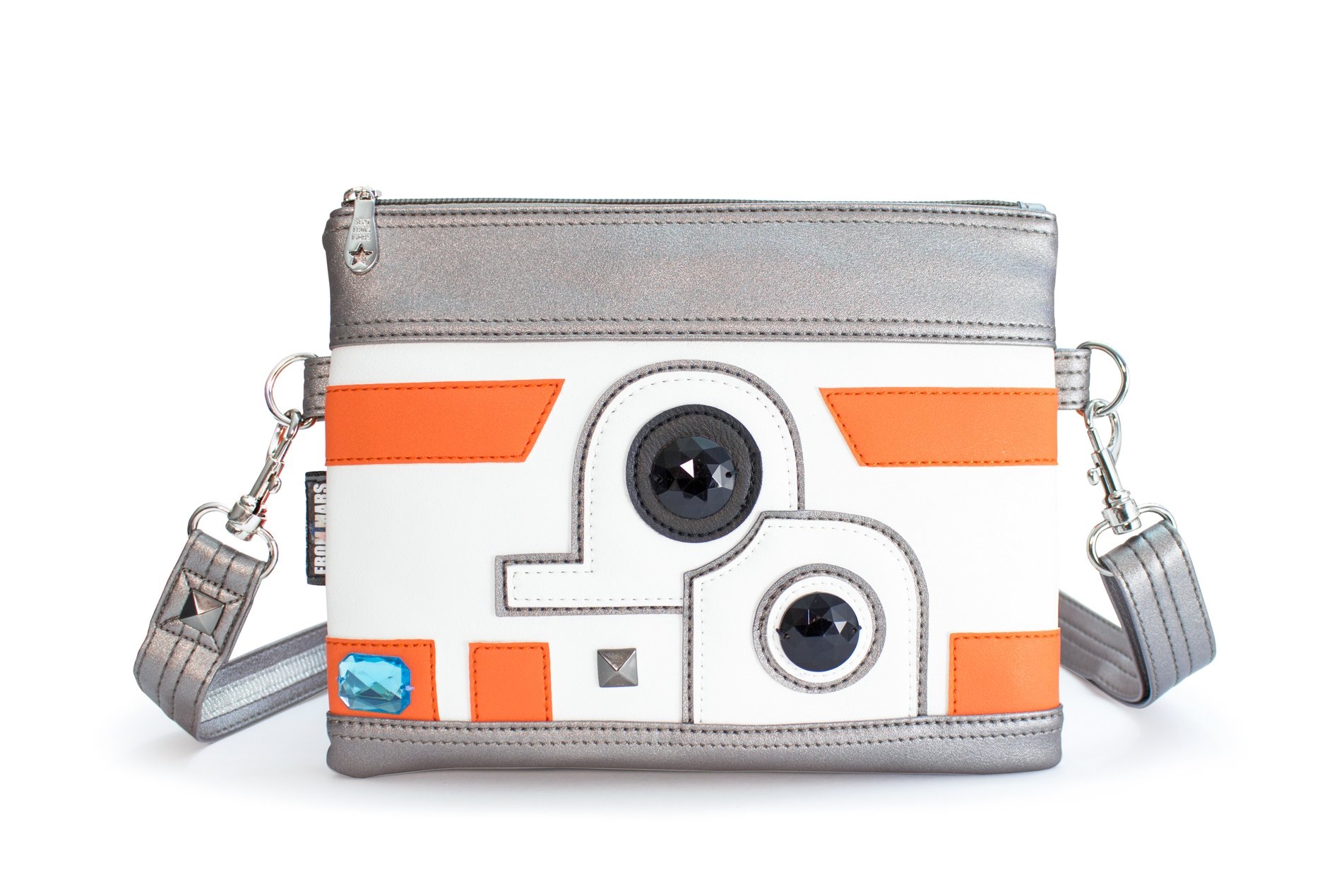 This fabulous Star Wars BB-8 inspired purse is now available from fan label Sent From Mars. Inspired by the cute orange and white BB unit, the faux leather purse features applique’ details and sew on gems. This is the latest in the ‘factory made’ range from Sent From Mars – so fans can get her fantastic Star Wars inspired purses for cheaper (compared to her handmade range). Check out our review of her earlier Han Solo inspired purse – the details in her designs are amazing!