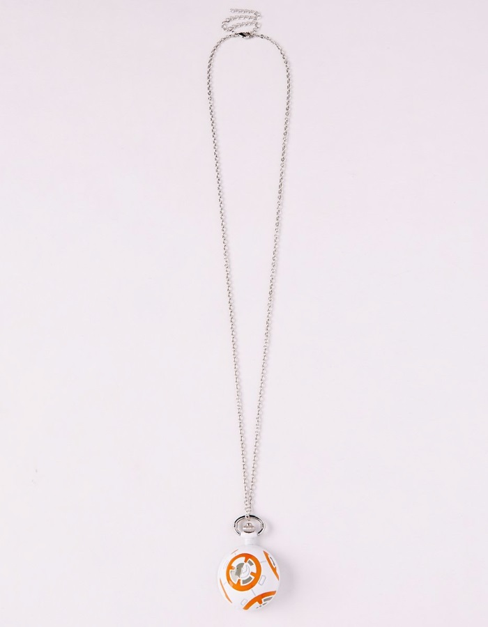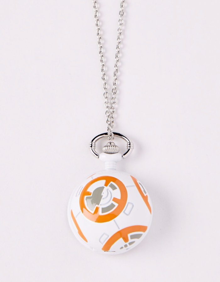 This cute BB-8 pocket watch necklace is available from Spencers. The silver-tone necklace features a dome shaped pendant of BB-8, which opens up to reveal a watch, complete with BB-8 on the watch face. The chain measures 12″ long, with a lobster-style clasp and a short length of adjustment chain.