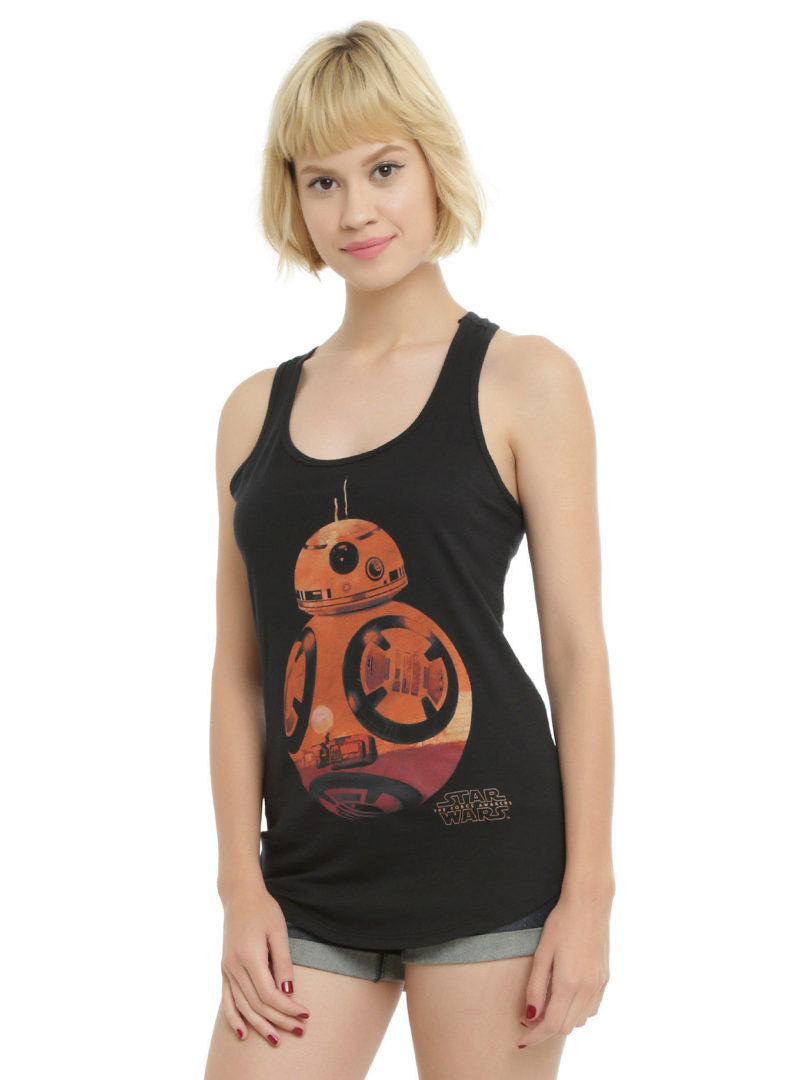 Hot Topic has a new women’s Star Wars tank top available. The women’s black racerback tank top features a front print of BB-8’s silhouette filled with an orange-tone image of Rey on her speeder on Jakku. The tank top is available in sizes XS to 3X, and is priced at US$20.50 to US$24.50 each (depending on size) – Hot Topic can ship internationally.