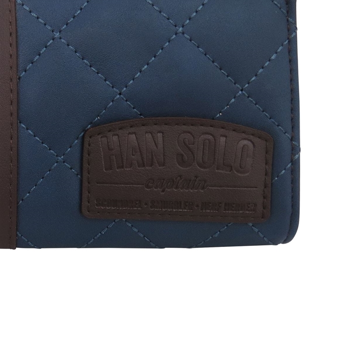 One side of this Han Solo wallet for women features a raised and metallic Rebel symbol measuring nearly 2.5″ across and 2.25″ high. ‘Side 2’ features a stitched, leather-like tag denoting Han Solo’s rank and previously held positions.