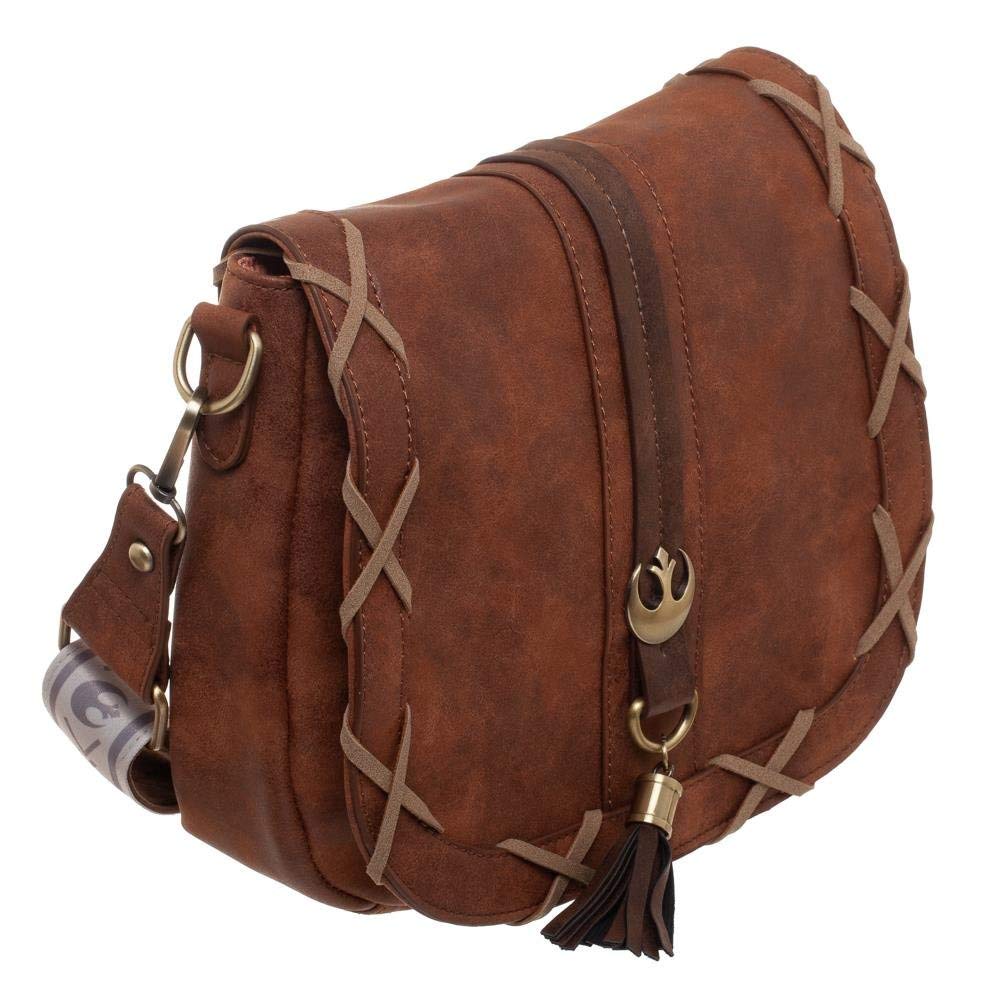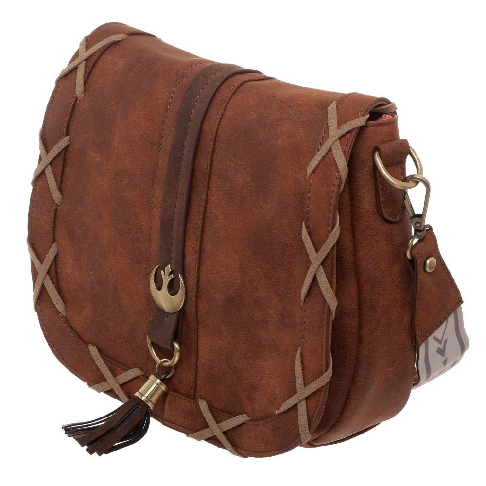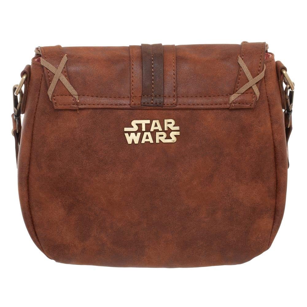 This amazing Star Wars Princess Leia handbag is now available on Amazon. Made by Bioworld, the faux leather saddlebag style purse is inspired by the brown dress Princess Leia wears at the ewok village on Endor in Return Of The Jedi. The handbag features crisscross style faux leather lacing detail around the top flap edge, and a small metal Rebel Alliance ‘starbird’ symbol on the front. The shoulder strap features a repeating Rebel Alliance symbol design, while the interior is lined with printed ewok artwork fabric!