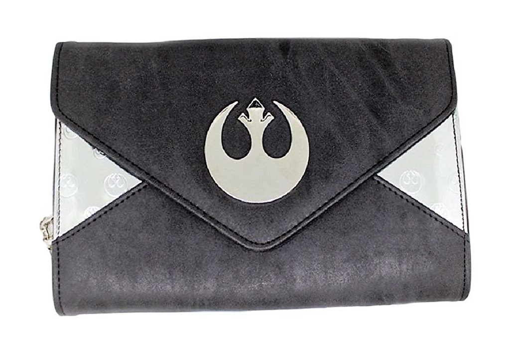 This Star Wars Rebel envelope clutch is available on Amazon. Made by Biworld, the envelope style wallet clutch is made from faux leather, and features a Rebel Alliance ‘starbird’ symbol on the front. Inside the clutch has a bill fold and multiple slots for cards. The wallet can be used as a hand-held clutch, or worn over the shoulder with the removable chain shoulder strap.