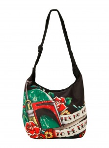 Hot Topic has added a new Boba Fett bag to their website. The ‘hobo’ style black bag features a tattoo themed Boba Fett design on the front, adjustable shoulder strap and closes with a snap button closure. It coordinates quite well with the Boba Fett wallet also available at Hot Topic (though I’m not sure if they are made by the same company). It is priced at US$19.50 – but Hot Topic have frequent on-line sales. They also ship internationally, which is great.