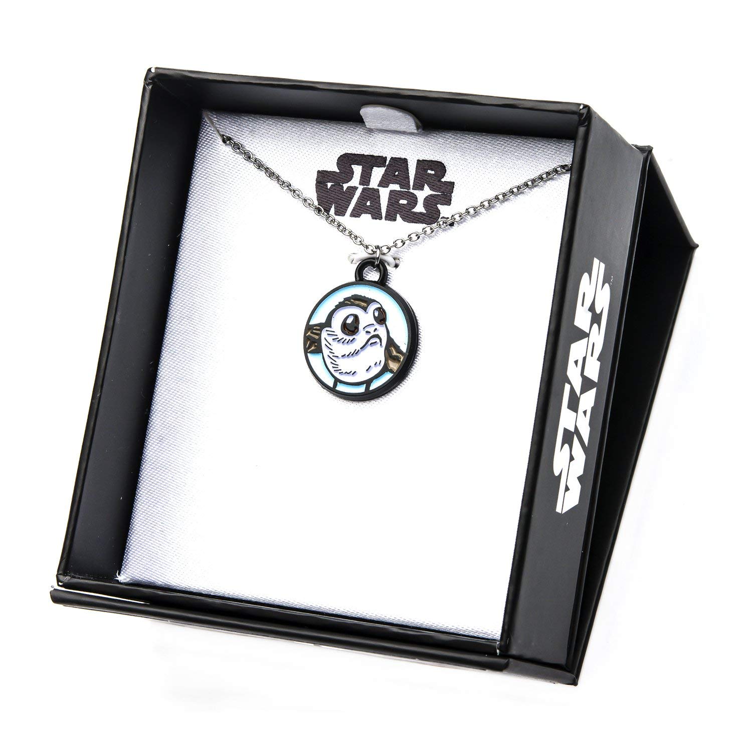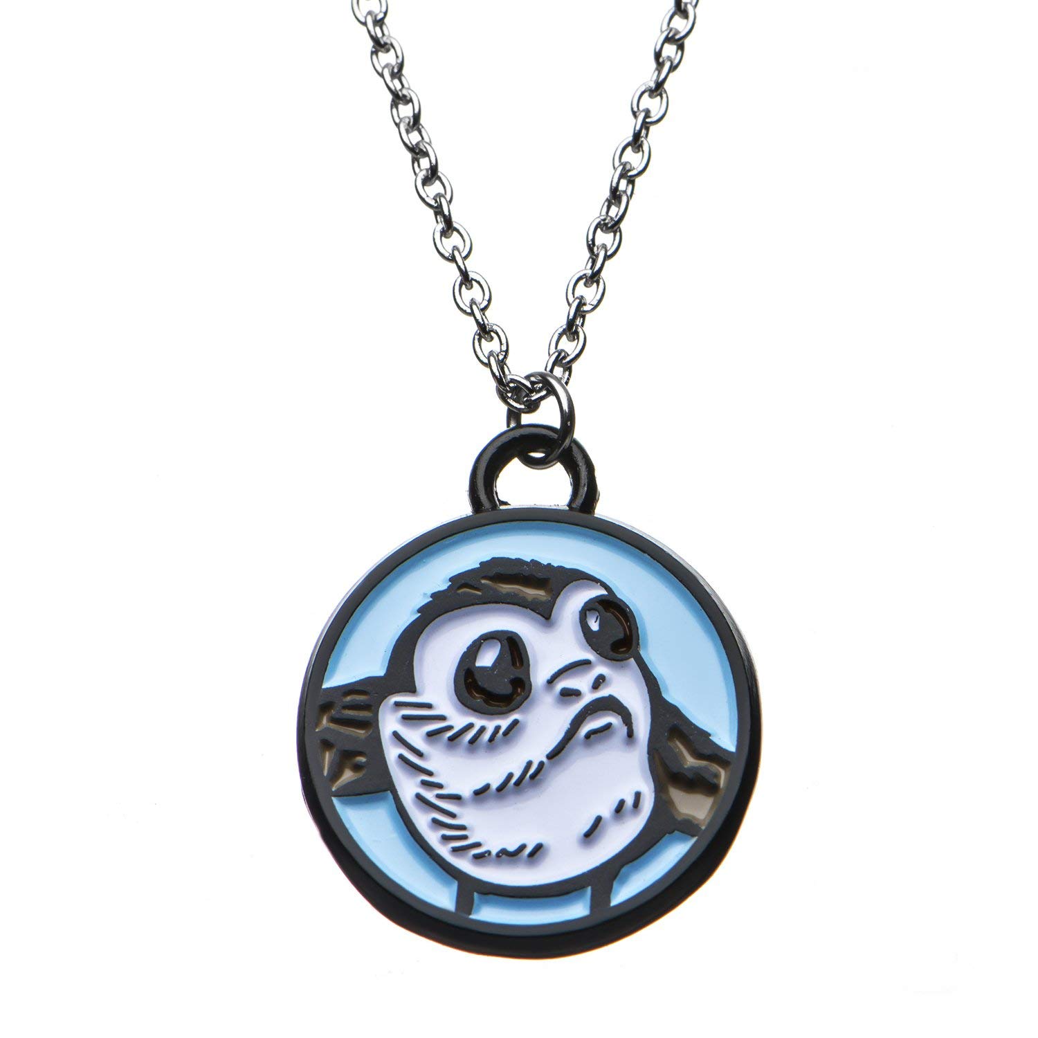 Show your love of the adorable porgs with this cute necklace by Body Vibe. The silver-tone chain necklace features a black circular pendant with an inset design of a porg. The pendent is accented with colour enamel, highlighting the porg design against a pale blue background.
