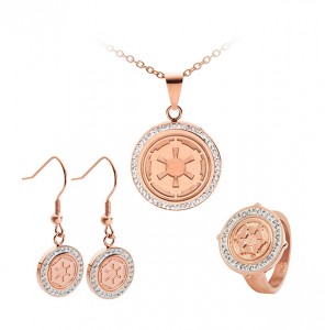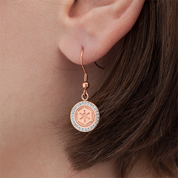 I thought we saw most of the upcoming women’s Star Wars apparel items at Celebration Anaheim, but there’s still more being released! Thinkgeek has added a new Star Wars jewelry collection to their website, which I don’t remember seeing at their booth. The new collection features the Imperial cog symbol in a bronze finish surrounded by rhinestones. The new design is available as earrings, a pendant and a ring (in women’s ring sizes 6, 7 and 8). The ring retails for US$29.99 each, while the pendant and earrings retail for US$34.99 each. The collection is made from stainless steel, so I suspect these are made by Body Vibe but I can’t confirm that yet. Many recent Star Wars ring designs have only been available in larger/men’s sizes, so it’s great to see some newer items specifically for women. I really love this set, the Imperial cog is so often done in black so it’s nice to see a variation – love the rhinestones too!