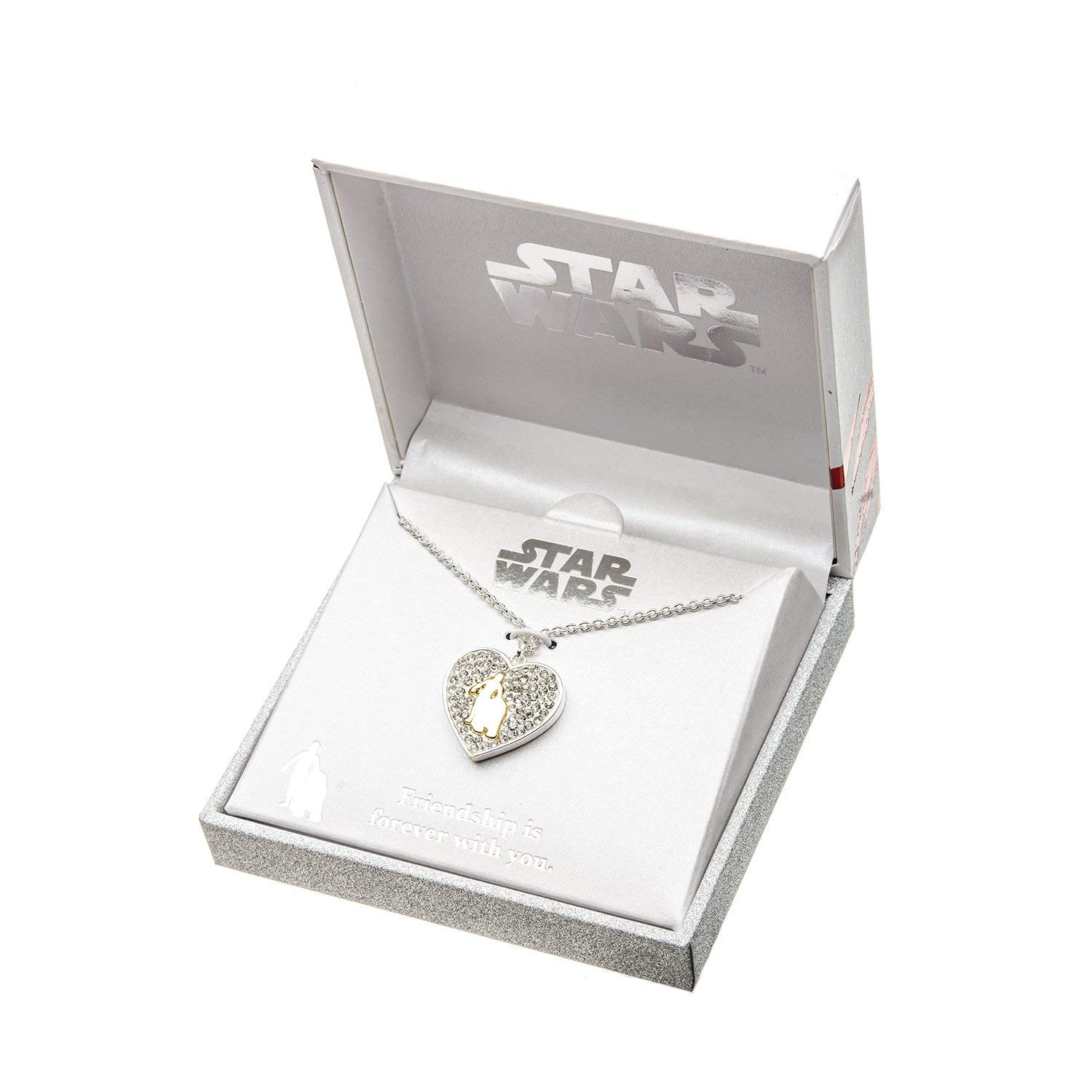 This beautiful Star Wars C-3PO & R2-D2 necklace is available on Amazon. Made by Body Vibe, the silver plated necklace features a heart-shaped pendant filled with clear rhinestones. In the center of the pendant is a raised gold-tone silhouette of C-3PO and R2-D2 together. The necklace comes with a lovely white gift box – the phrase ‘Friendship Is Forever With You’ is printed in silver foil on the box insert.