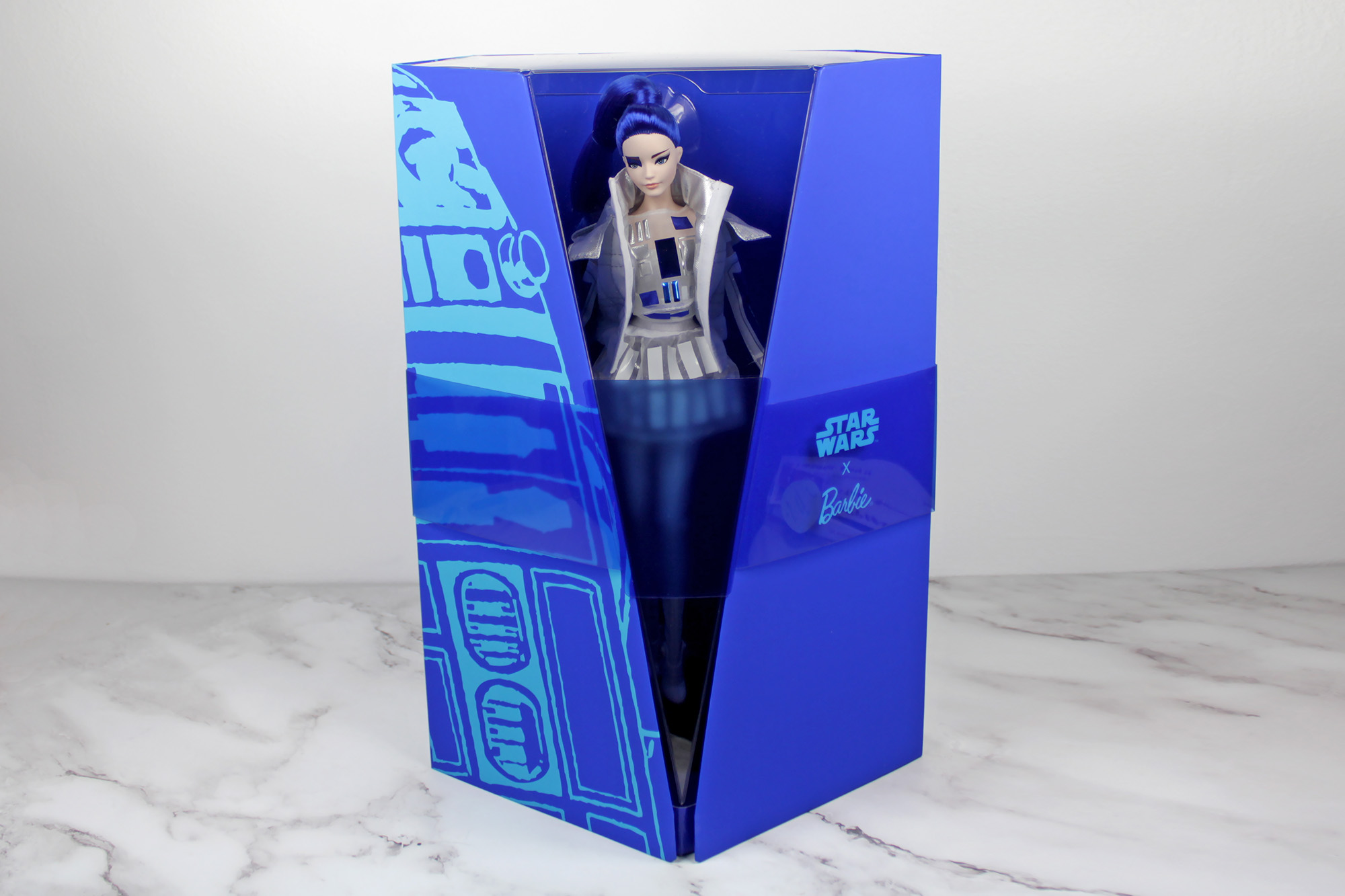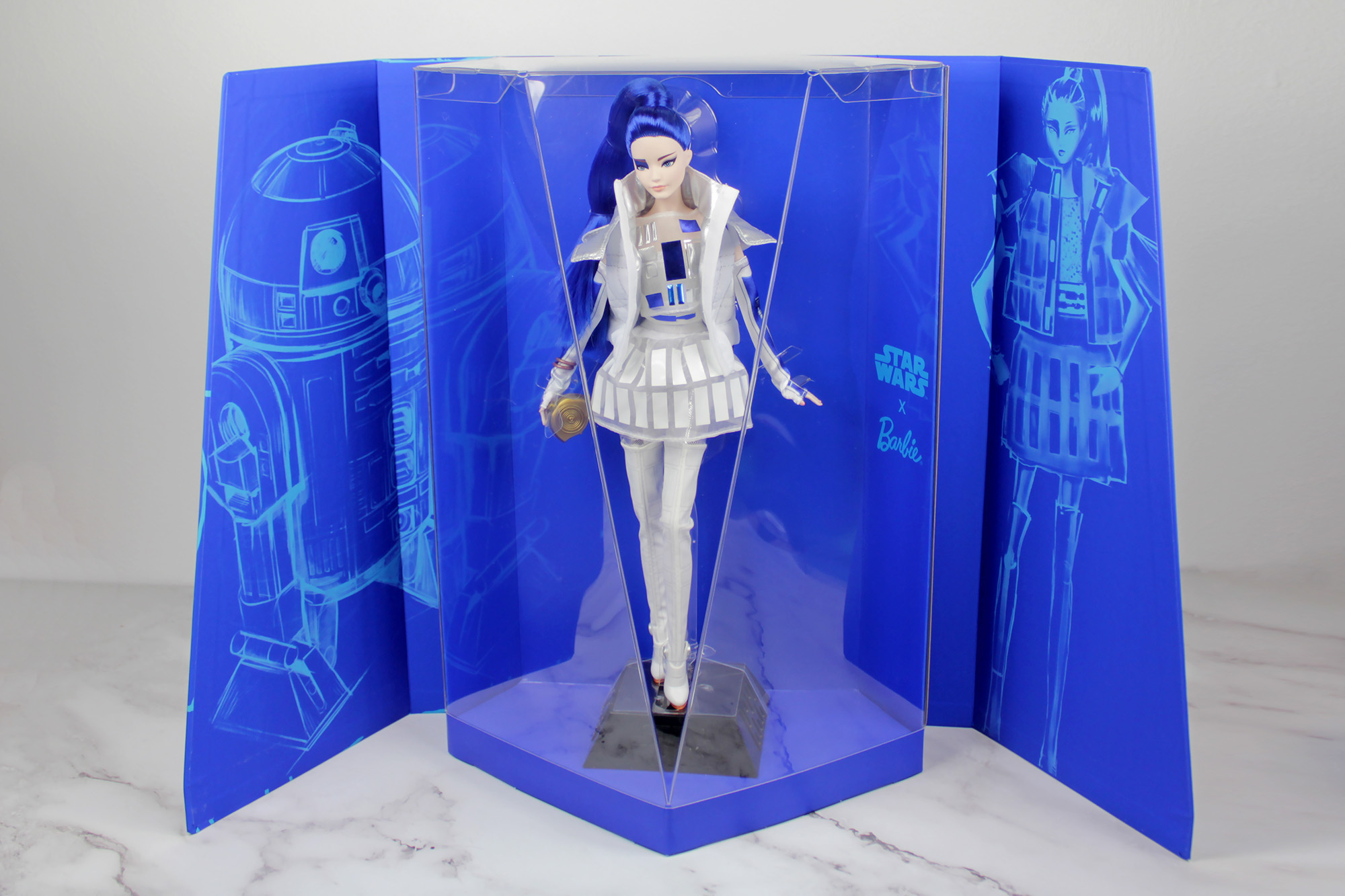 This collectible Star Wars R2-D2 x Barbie doll captures the lovable droid’s look in a geometric ensemble with a dome skirt, bomber jacket and thigh-high boots over silvery tights. A vibrant blue ponytail and “radar eye” detail complete the look.