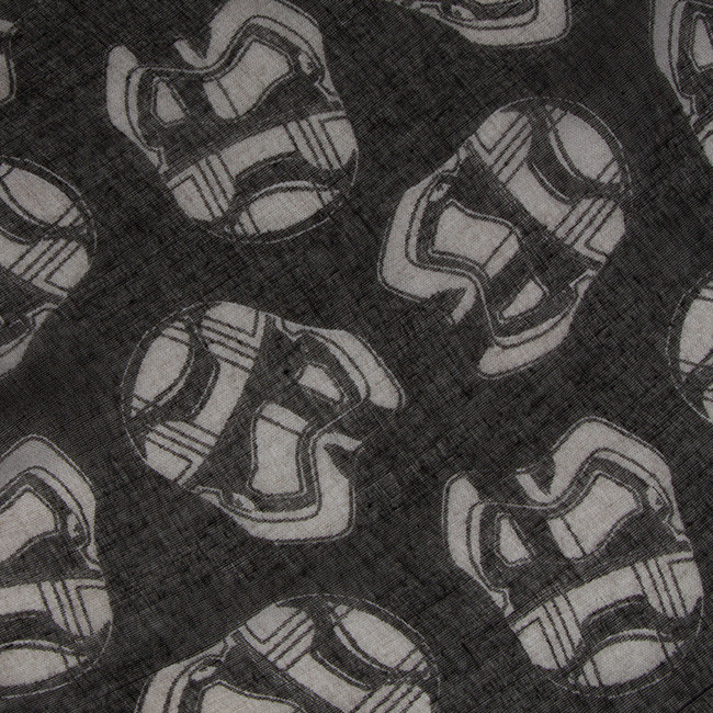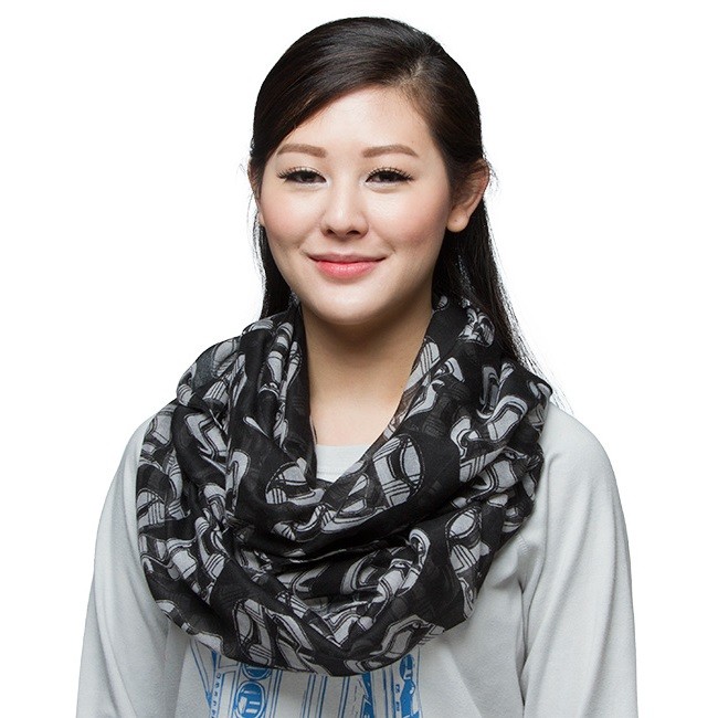 Thinkgeek has a new women’s Star Wars fashion scarf available. The black infinity scarf features an all-over repeating print of Captain Phasma’s unique helmet. Made from 100% polyester, the scarf is priced at US$24.99 each – Thinkgeek can ship internationally, which is great. This scarf joins the BB-8 blueprint and First Order Stormtrooper scarves that were released by Thinkgeek earlier this week.