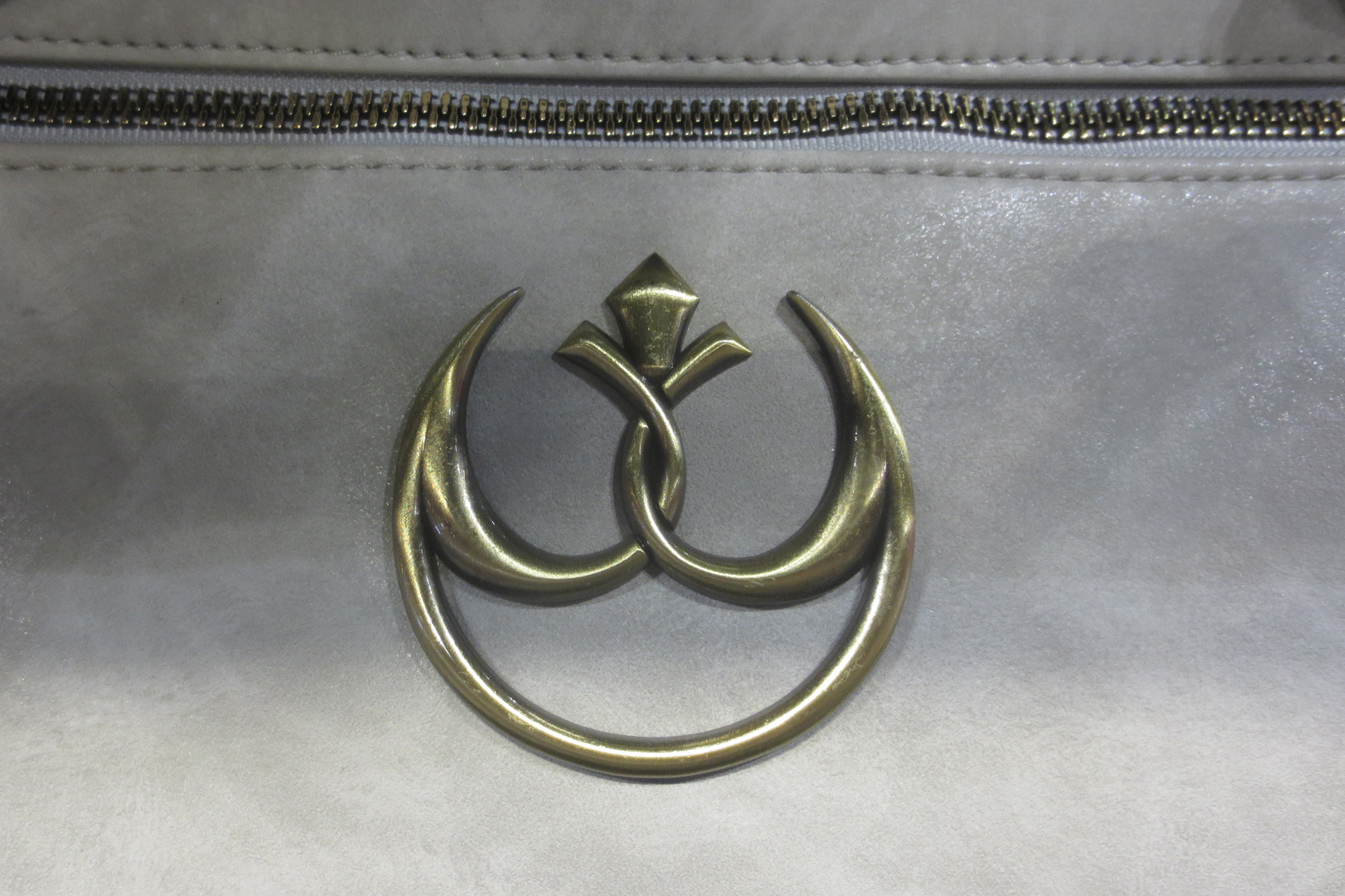 The soft grey coloured faux leather handbag features a raised metal Rebel Alliance symbol, with an intertwined design. The top-stitched radiating lines are reminiscent of the shoulder details of Rey’s vest, a lovely subtle element.