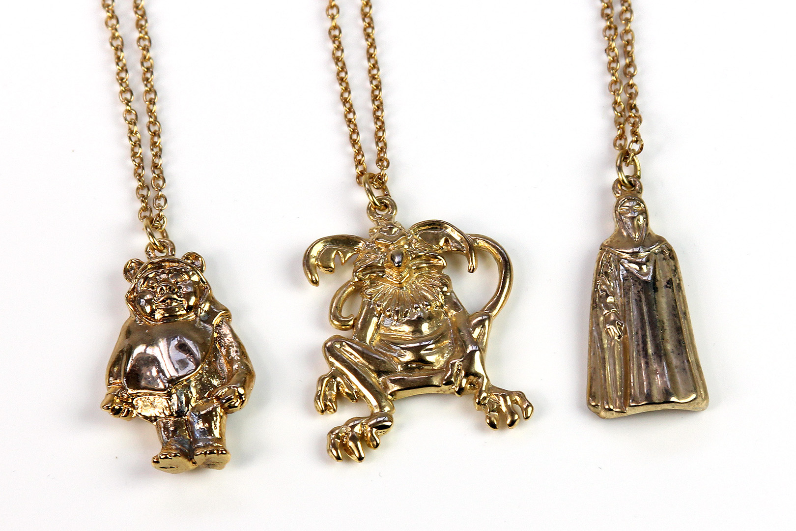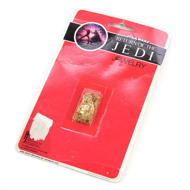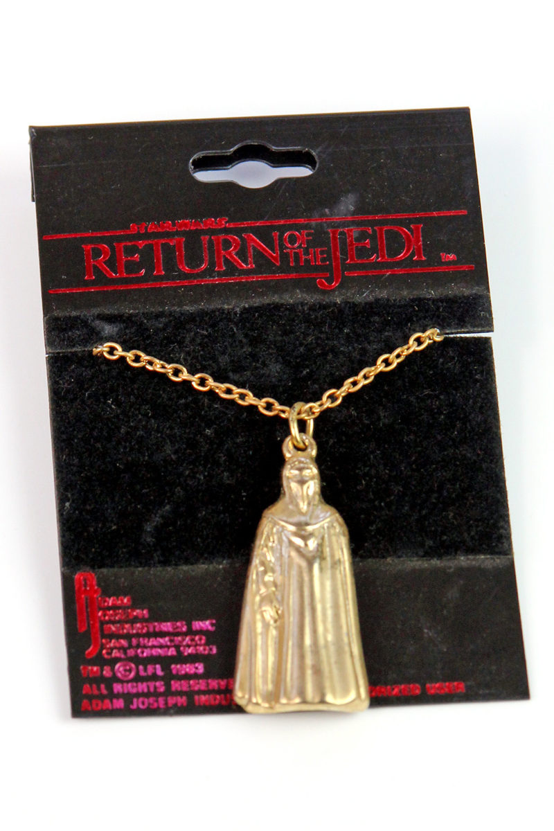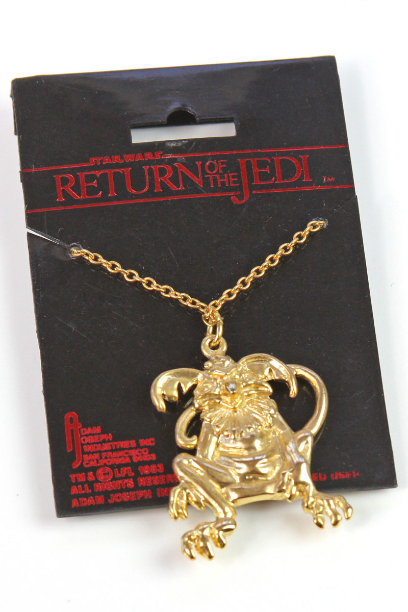 For Return of the Jedi, the Star Wars jewelry license was held by Adam Joseph Inc. While the ‘text’ necklaces are easier to find, they also made a range of sculpted character necklaces. According to Collectors Archive, there were five gold tone necklaces fearturing C-3PO, R2-D2, Royal Guard, Wicket and Salacious Crumb. Each necklace was available in two styles of packing – blister card and jewelry card. Some unusual inclusions for designs – not often you find Salacious Crumb featured in merchandise, let alone jewelry! Of course I am very keen to track these necklaces down for my own collection – so far I have bought the Wicket, Royal Guard and Salacious Crumb necklaces.