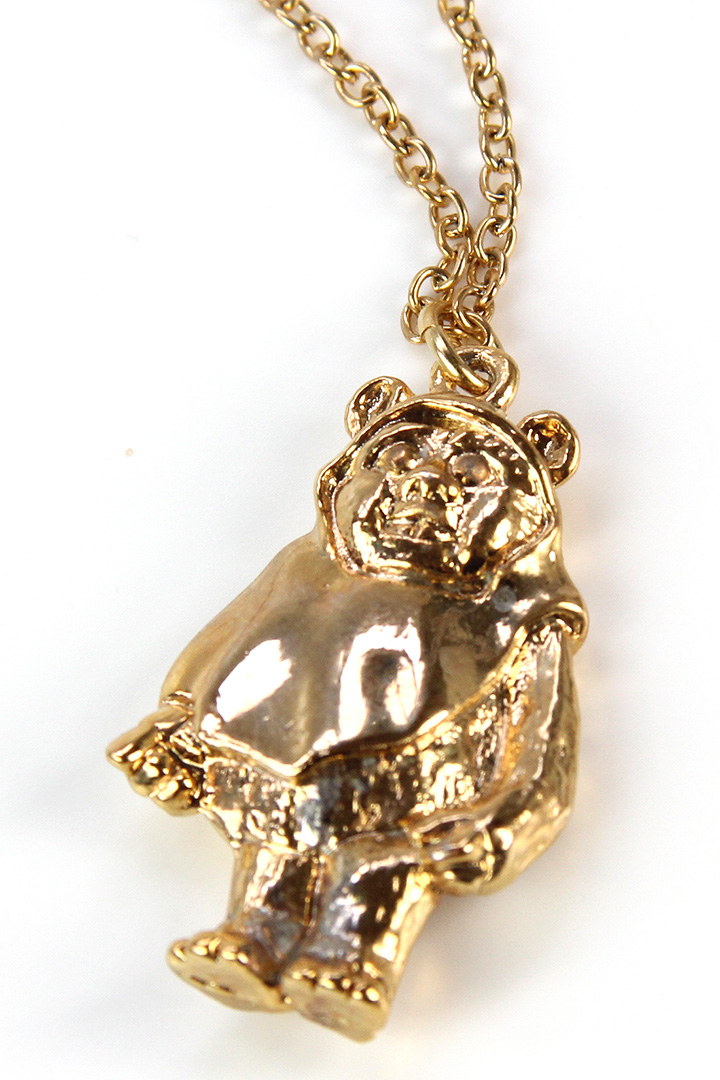 The Wicket necklace was the blister card version. While I don’t usually like to open vintage carded items, the card wasn’t mint, having suffered some damage – and it was only US$0.99c! It is always a little bit of a gamble buying vintage jewelry in regards to condition. As you can see in my closer photo of the pendant, there is some discolouration/damage, with a few spots appearing silver, most noticeable just above the feet. Considering it’s age, it’s not surprising, and it only cost me 99c on ebay. The sculpt is really cute, I’m on the look out for another one in better condition. Wicket measures approximately 3cm tall, with the non-adjustable chain measuring approximately 56cm long.