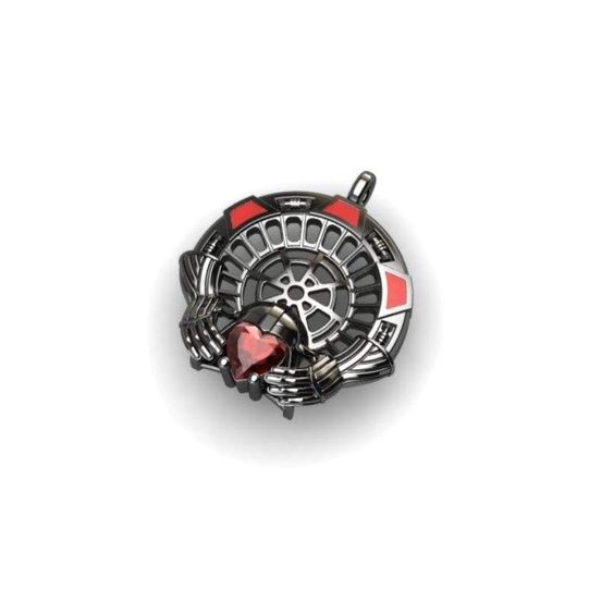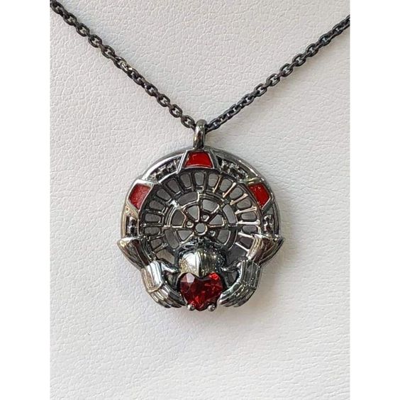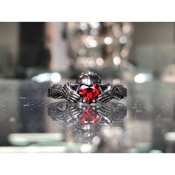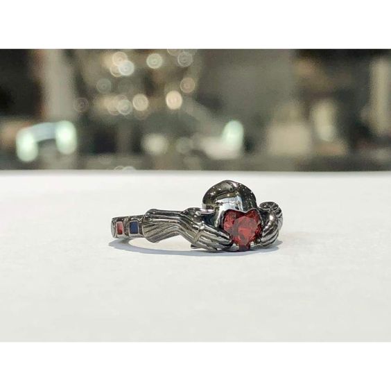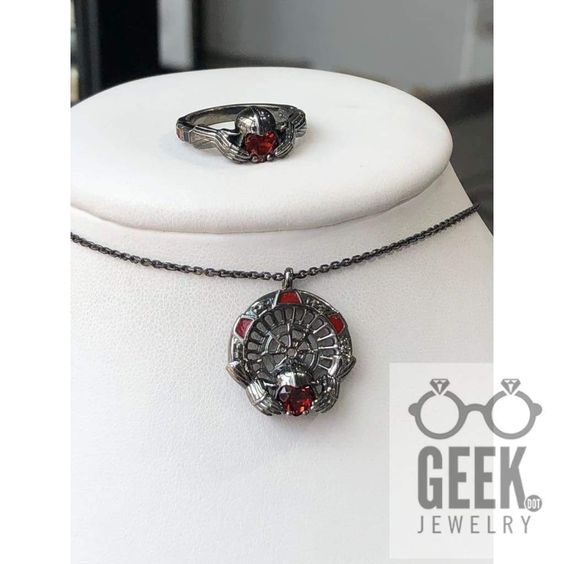 Inspired by one of the most iconic villains in pop culture, the Darth Claddagh ring and pendant set will help bring balance to your jewelry box! Exquisitely hand crafted and available in silver, gold, or platinum. It is set with a beautiful heart shaped garnet and finished off with enamel accents and a dark rhodium coating to represent your dark side!
