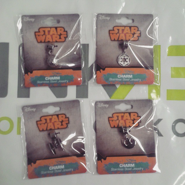 My third stop was Thinkgeek, to check out the new Death Star charm. They have a display case with all the Star Wars charms they stock, and two promotions – buy any 3 Star Wars charms, get 1 free, and a free leather charm bracelet with every charm purchase. I had already planned to buy the Death Star charm, so I made use of the promotion to pick up other charms on my wish list. So I’ve added the Death Star, TIE Fighter, Rebel Alliance logo and Imperial logo charms to my collection.