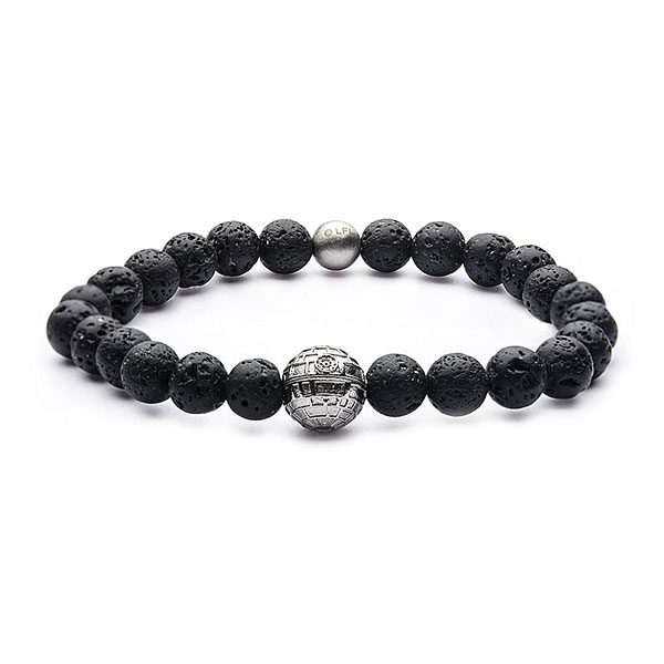 This fantastic new Death Star bead bracelet is now available at ThinkGeek. The elastic stretch bracelet features a stainless steel 3D sculpted bead of the Death Star, surrounded by black lava rock beads made from molten basalt.