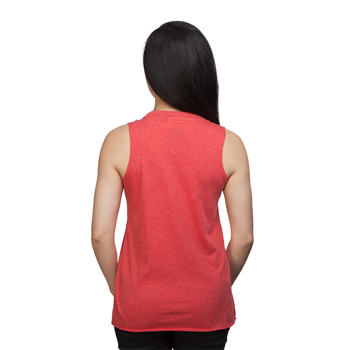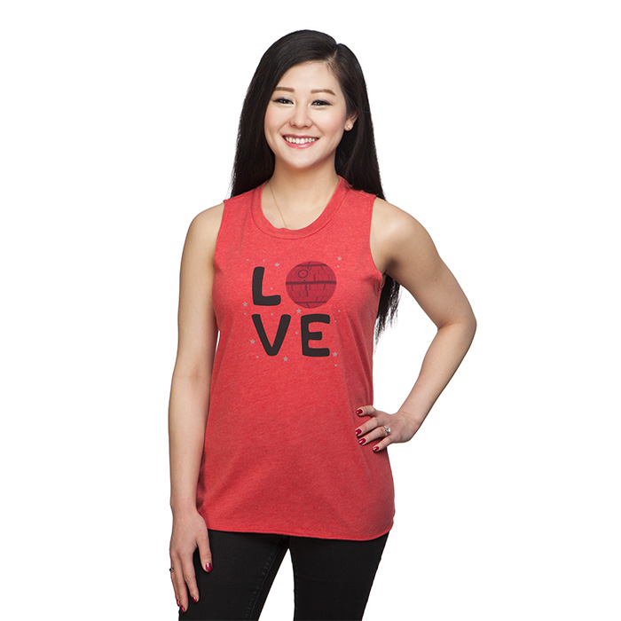 This heather red ladies’ tank features the stacked LOVE design with the Death Star for the O.