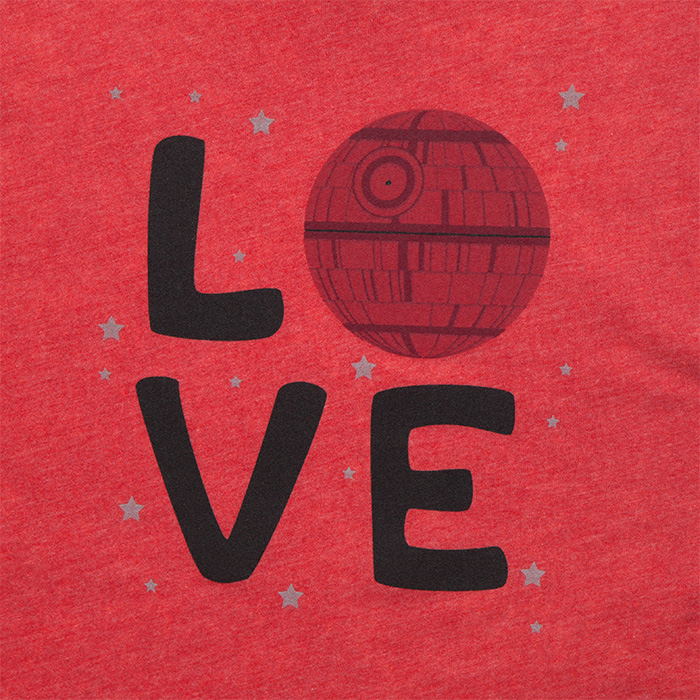 This women’s Star Wars Death Star Love tank top is now available at ThinkGeek. The women’s heather red tank top features a front print of the word ‘LOVE’, but with a Death Star for the ‘O’. The tank top is made from 60% cotton / 40% polyester, and has raw/unfinished edges at the sleeves and hem.
